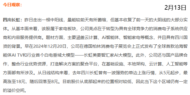四川长虹:昨天放量涨停,从底部上来已出现三个涨停板,表现十分强势。该股属于算力题材,原本是传统家电行业企业,近期转型为具有全球竞争力的消费电子系统供应商和内容服务提供商。公司通过旗下长虹佳华,强化与国产品牌合作,整合行业优势资源,打造解决方案聚合平台。在基础设施、本地架构、云计算、人工智能等方面,长虹佳华已获得华为存储、数通安全计算、数据中心等授权。因此,该股在整个算力板块中表现优秀。去年该股曾走出一波强势单边走势,也是受算力题材影响。今年能否复制去年的辉煌,目前还难以确定。目前股价不到13元,而去年高点为18元,因此仍有一定的上涨空间。