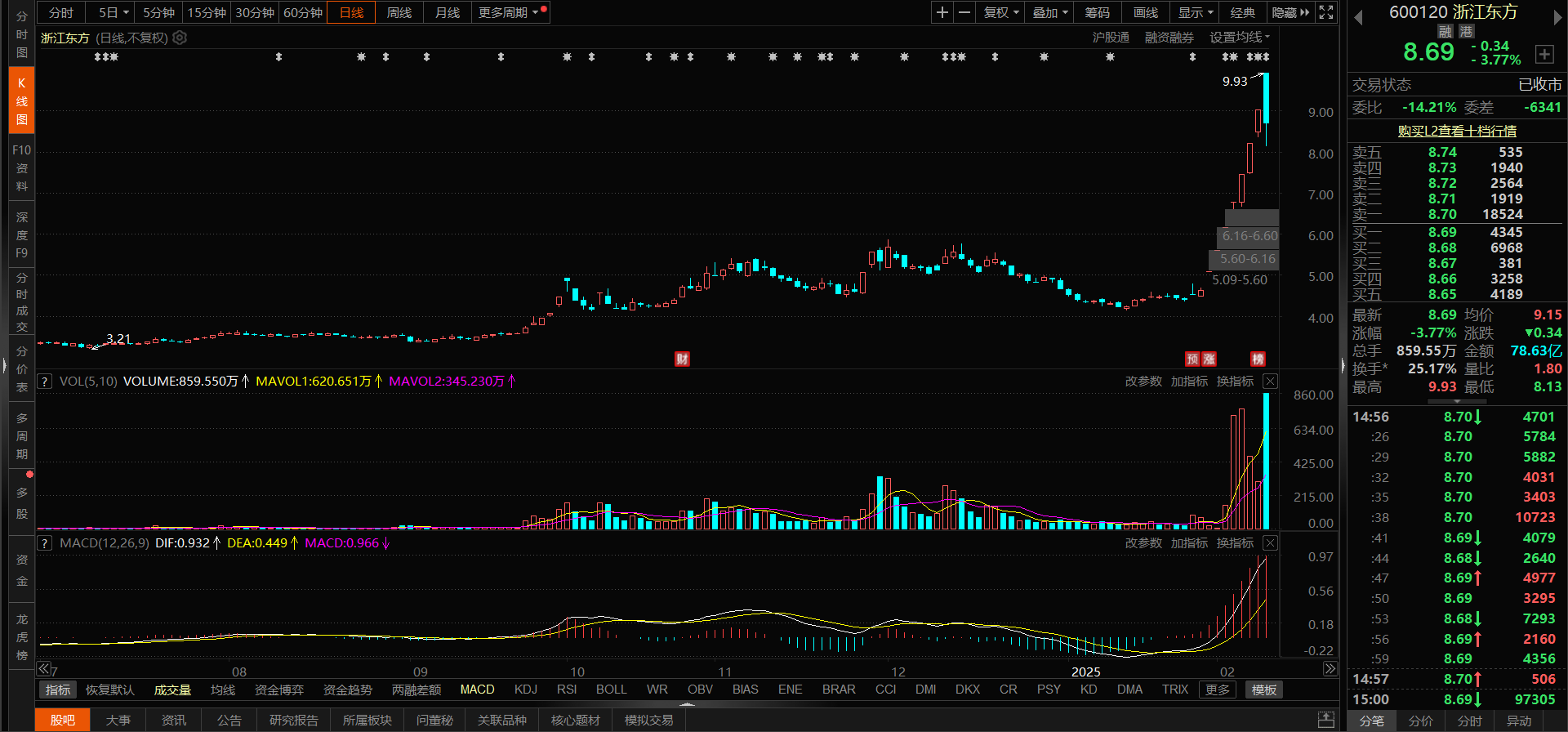 浙江东方:昨天未能晋级涨停,冲高回落,量能放出倍量。目前还难以判断行情是否已经结束。该股属于多元金融板块,是浙江重点打造的国有金融控股平台,涵盖信托、期货、融资租赁等业务。前期该股走出强势单边上涨行情,一方面是因为有传言公司是杭州深度探索的股东之一,公司澄清后股价仍继续上涨;另一方面又有传言公司是杭州宇树科技的股东之一。由于这些密集的利好消息,公司股价持续上攻。昨天出现一根放量的高开低走大阴线,但行情尚未明确结束。今天观察在于能否收出阳线反包,如果能够收阳线反包,则行情有望延续;如果继续下跌,则行情可能告一段落。