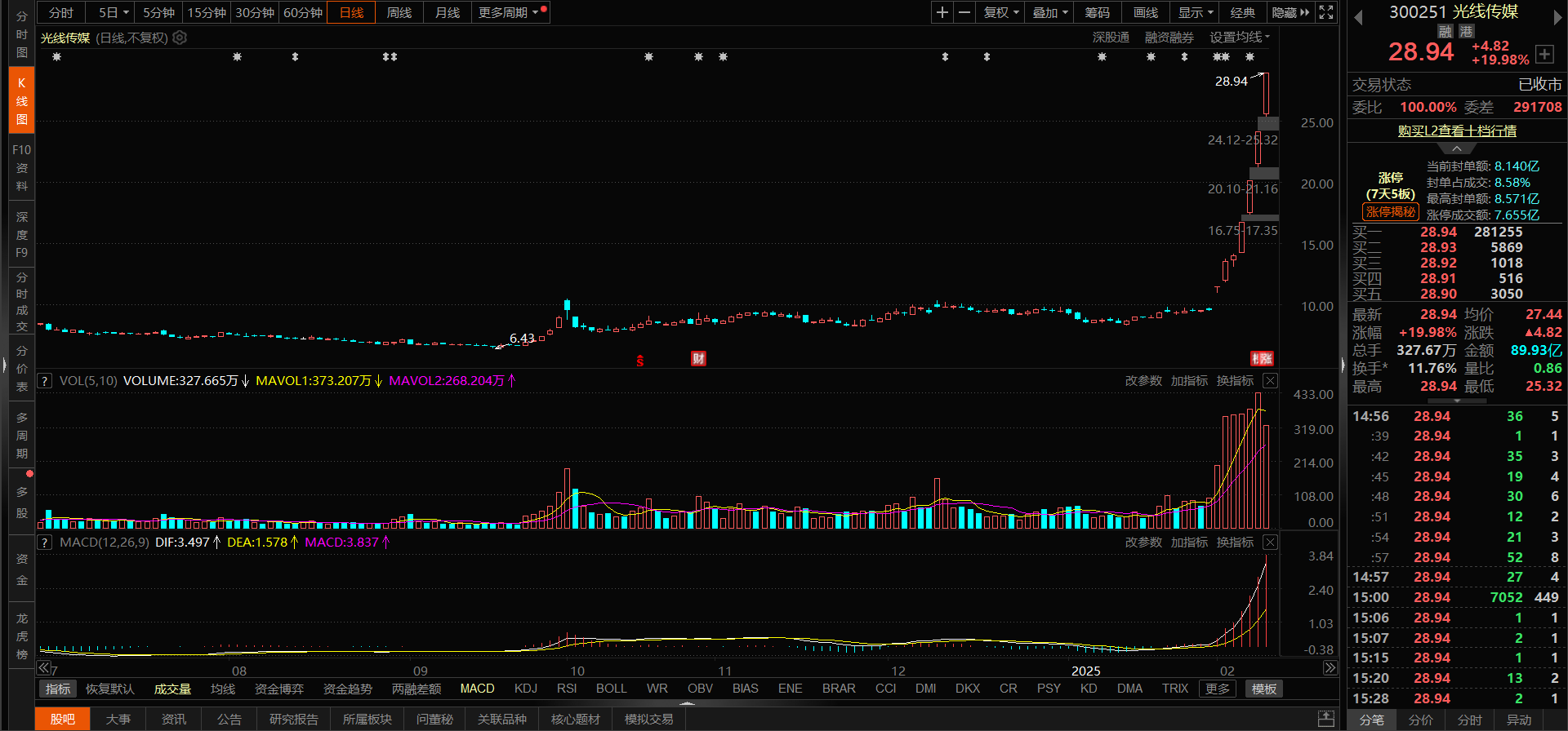 光线传媒:该股走势十分强势,已晋级4个20厘米的涨停板,从底部算起已接近翻三倍。昨天涨停时未放量,筹码仍处于锁定状态。该股属于影视院线板块,是国内最大的民营电视节目制作和运营商之一。其强势表现主要得益于春节档电影《哪咤 2》的表现。如果该片总票房能达到160亿,公司分成可能达到30-40亿元,将显著增厚公司一季报业绩。该股题材和基本面都相当不错,只要不收阴线,行情就不会结束。