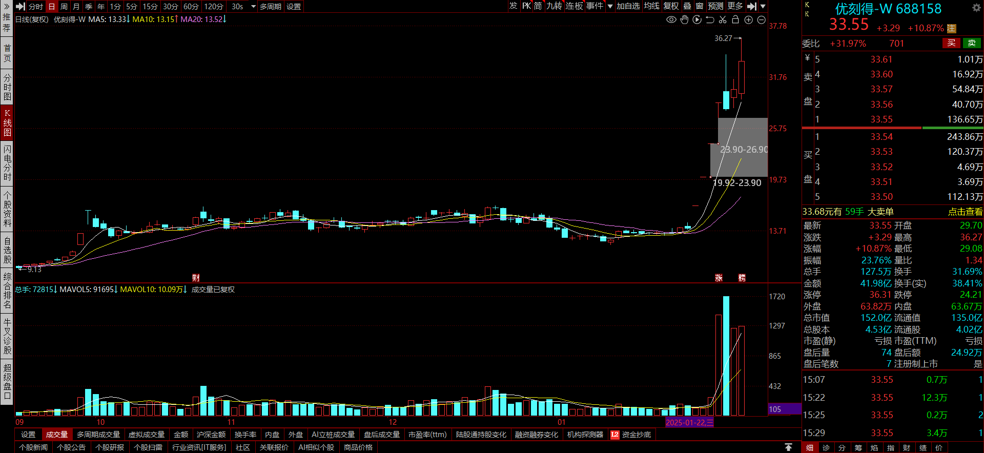 优刻得-W:公司属于 IT 服务板块,是一家第三方云计算服务商。其为客户打造安全可信赖的语音计算平台,主营业务是自主研发并提供以计算、存储、网络等企业必需的基础IT产品为主的云计算服务。 在题材方面,公司涉及DEEPSEEK概念、智谱AI概念、算力租赁等。根据公司官微消息,公司得云平台于2月3日上线了DEEPSEEK大模型。公司是国内领先的中立第三方云计算服务商,自主研发并提供计算、网络、存储等IaaS和基础PaaS产品,以及大数据、人工智能等产品。在算力租赁方面,公司早在2023年就已布局,使得该股基本面和题材都相当优秀。从技术走势来看,昨天走出放量大阳线,收复了前一天的上影线,显示出强势状态。不过,昨天也出现了上影线,表明上方存在较大抛压。今天的关键在于能否突破昨天的高点,若能突破,则上涨趋势有望延续。