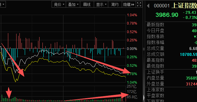 昨天的上证指数下跌分两个部分,一个是午后开盘,那是放量急跌,量能超过了午前的两倍,第二个是下午2点后,在急跌后指数拉到了0轴附近,再次开启了下跌模式,这次走的是毫无抵抗的下跌,不回头,45度角一次性跌下去,量能逐步放大。可见市场兑现力度还是比较强的。