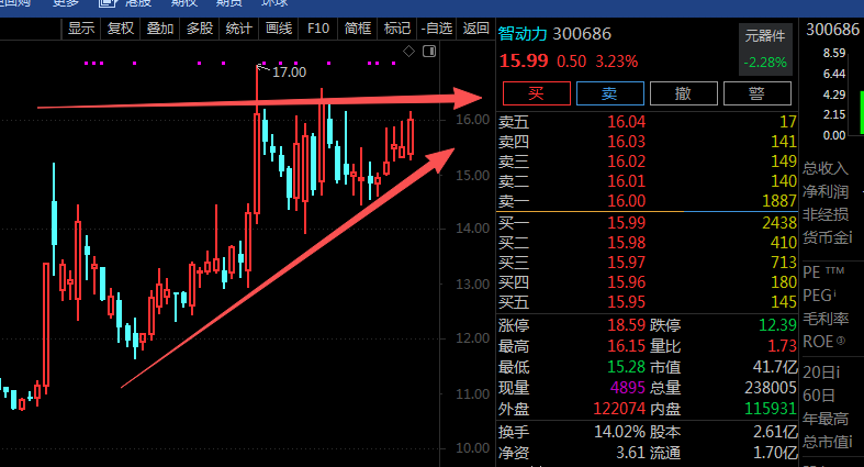 智动力:从下图可以看出这个票已经是处在了突破的边缘了,至于往哪个方向暂时未可知,但是按照其量价的配合,这次的突破往上的概率较大。上涨趋势线不能跌破,跌破就意味着方向选择是向下,关键位置必须是要放量,要不然过不去,即使过去也得回来,一字板除外,这个就不用去抬杠什么的。主要就是做消费电子的,这个方向好像也蛮长时间没动了,是不是也该动动了。