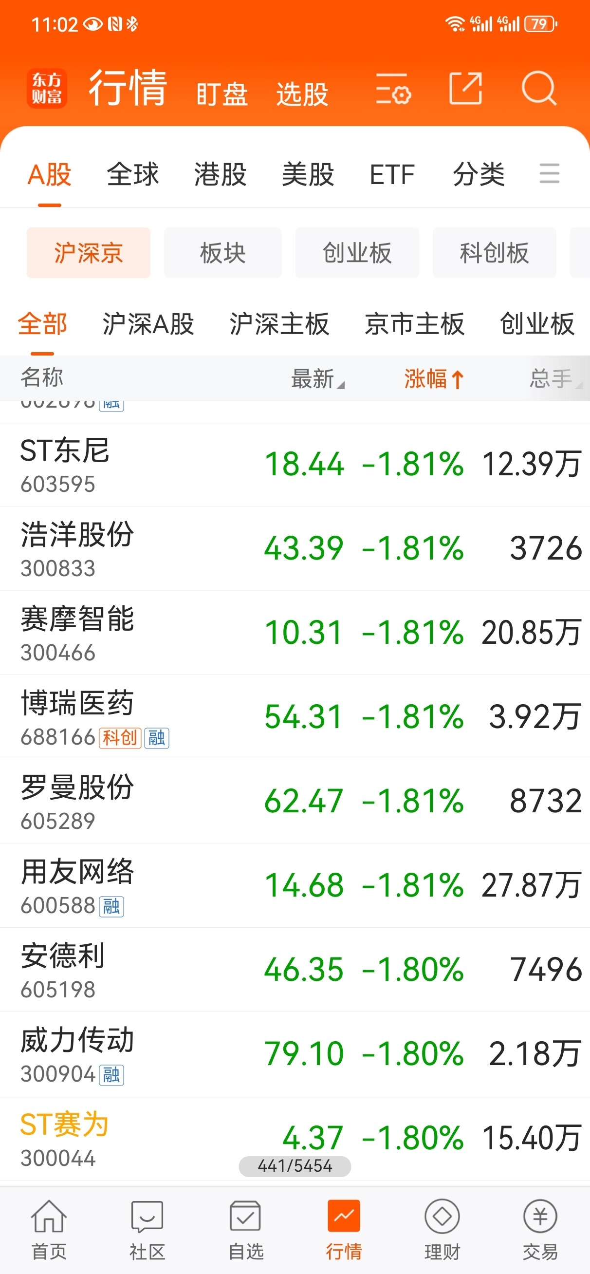 多苟的天塌了,A股5454股,昨天跌幅排301,今天跌幅排441,连续两天跌幅超