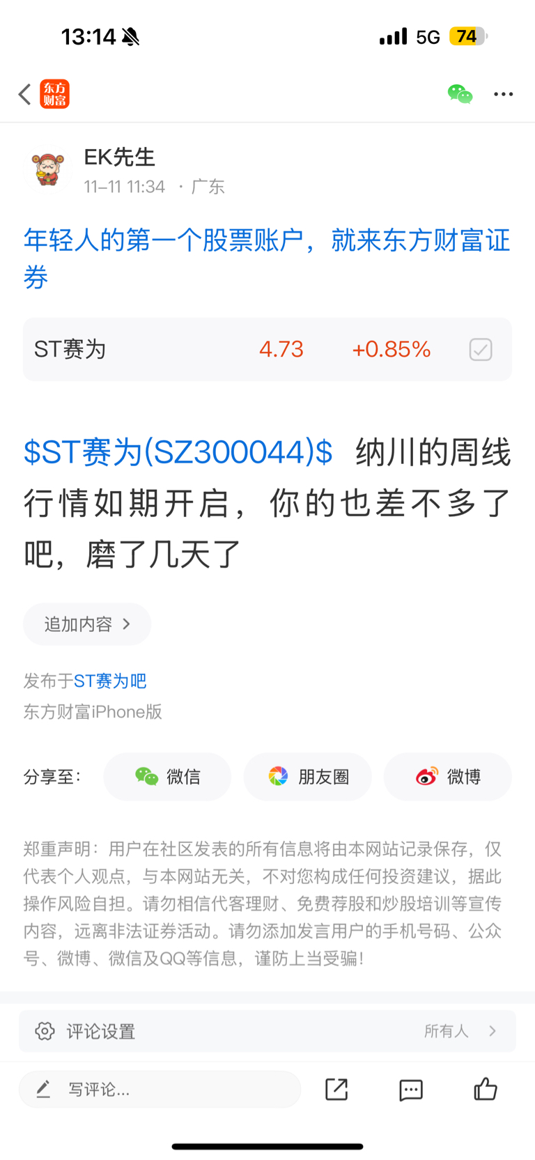 $ST赛为(SZ300044)$ 今天短线突破平台新高,解放了不少套牢盘,同时也洗那些T苟