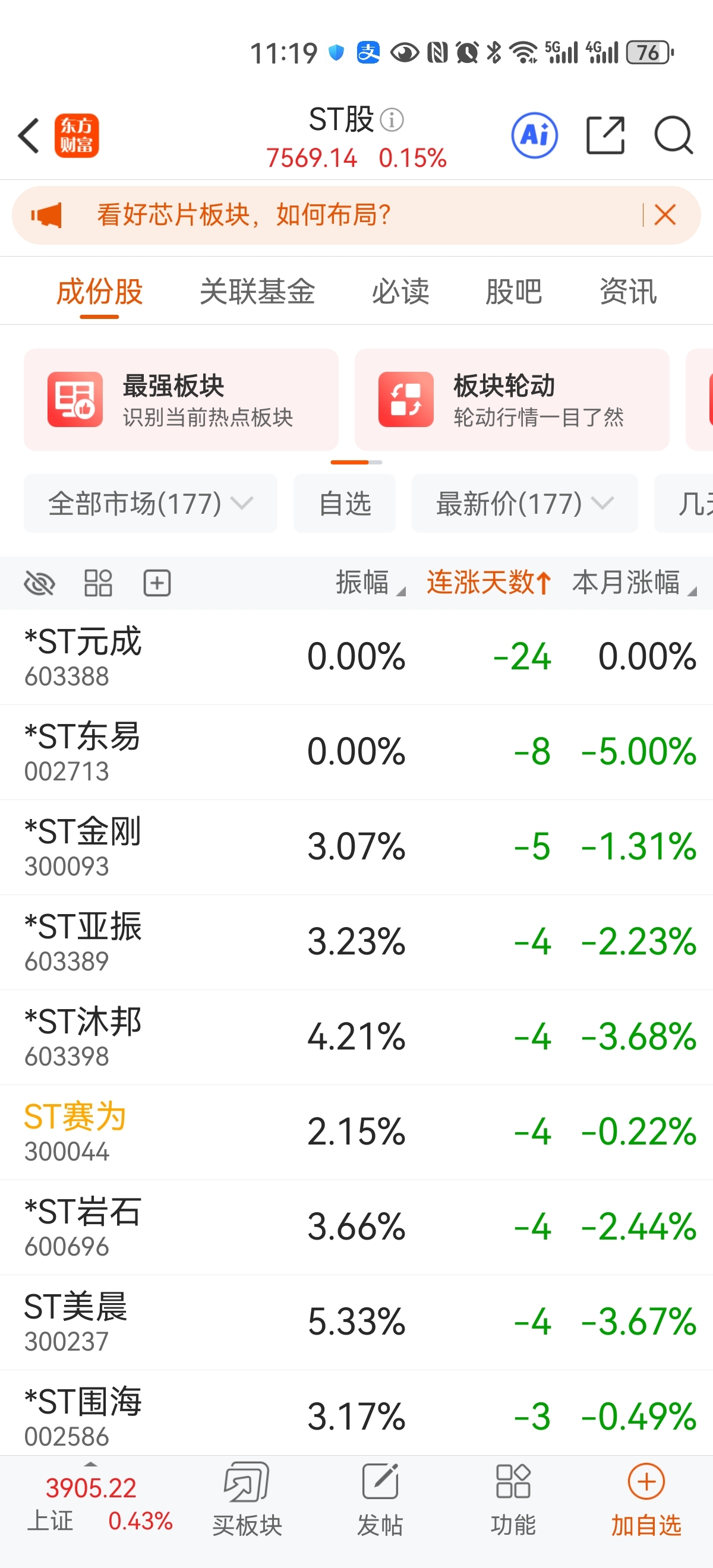 $ST赛为(SZ300044)$ 即使在ST板块177只股,也只有8只股连跌超过4天。整个A股5464只股,连跌超过4天也只有73只股。无论跌的时间长度,跌幅,都超过95%的股票。那些还在唱多的多苟是什么给了你们力量唱多?苟粮吗?
