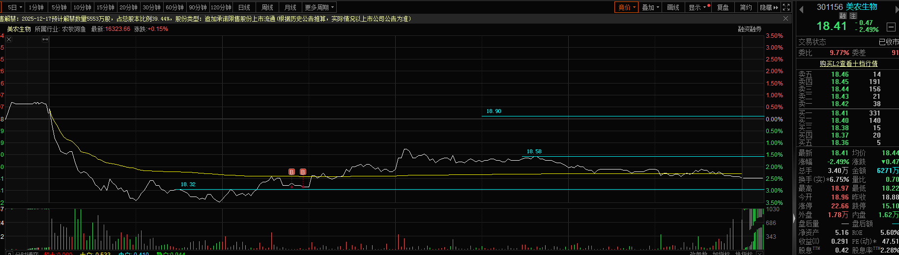 智能自控还在持有,因今天没有玩的,昨日观察过伟星新材,在它昨日10.46的时候想动手买底仓了,后来想想算了,今早挂10.39买,没买成,最低10.4.闲的无聊翻看到了美农生物,看了它的裸K后,在18.34打了底仓,有兴趣的股友把此股放在自选了,别看它后期要有很多股上市。想表达的是,过后怎么看待美农的试盘线,与它洗盘后缩量买入问题。本人买的它的底仓截图