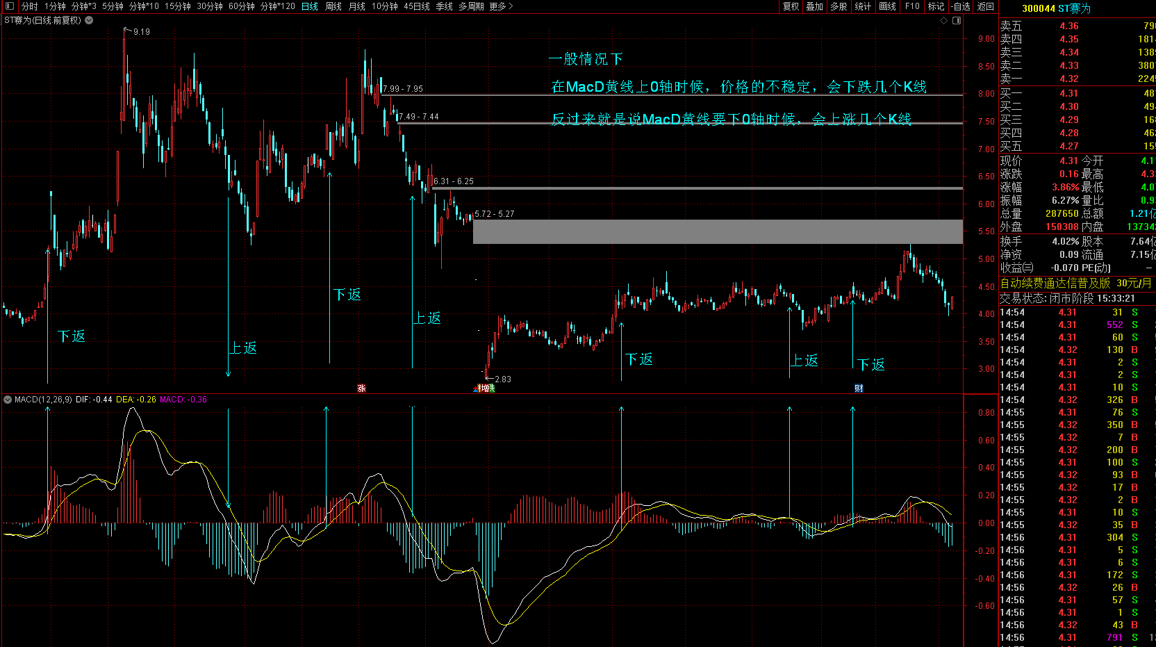 用技术指标MacD和股友说一下它黄线将上和将下0轴时候K线的一般情况,这也就是我上贴说的宽泛出下周3天之内不能再破4.11的事,不破或许黄线下不到0轴,破了就是黄白线都在0轴下方运行,接下来对60线价格的冲击旧画问号了?截图里的上返下返的天数,谁也拿捏不准的!
