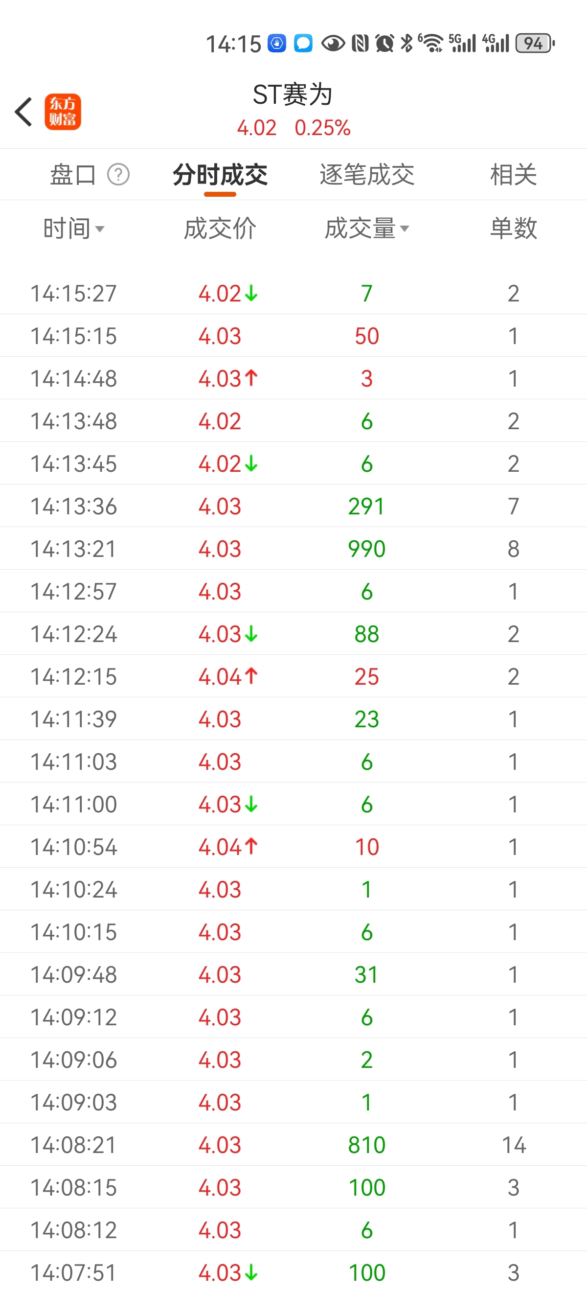 $ST赛为(SZ300044)$ 让人绝望的分时交易,几乎看不见红单
