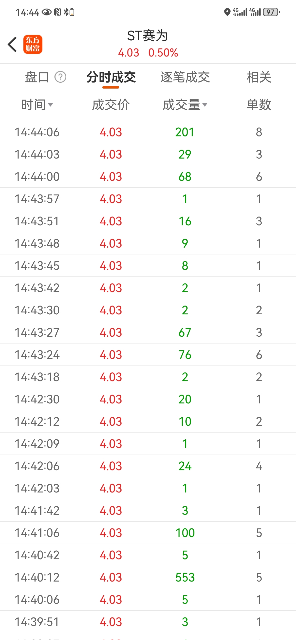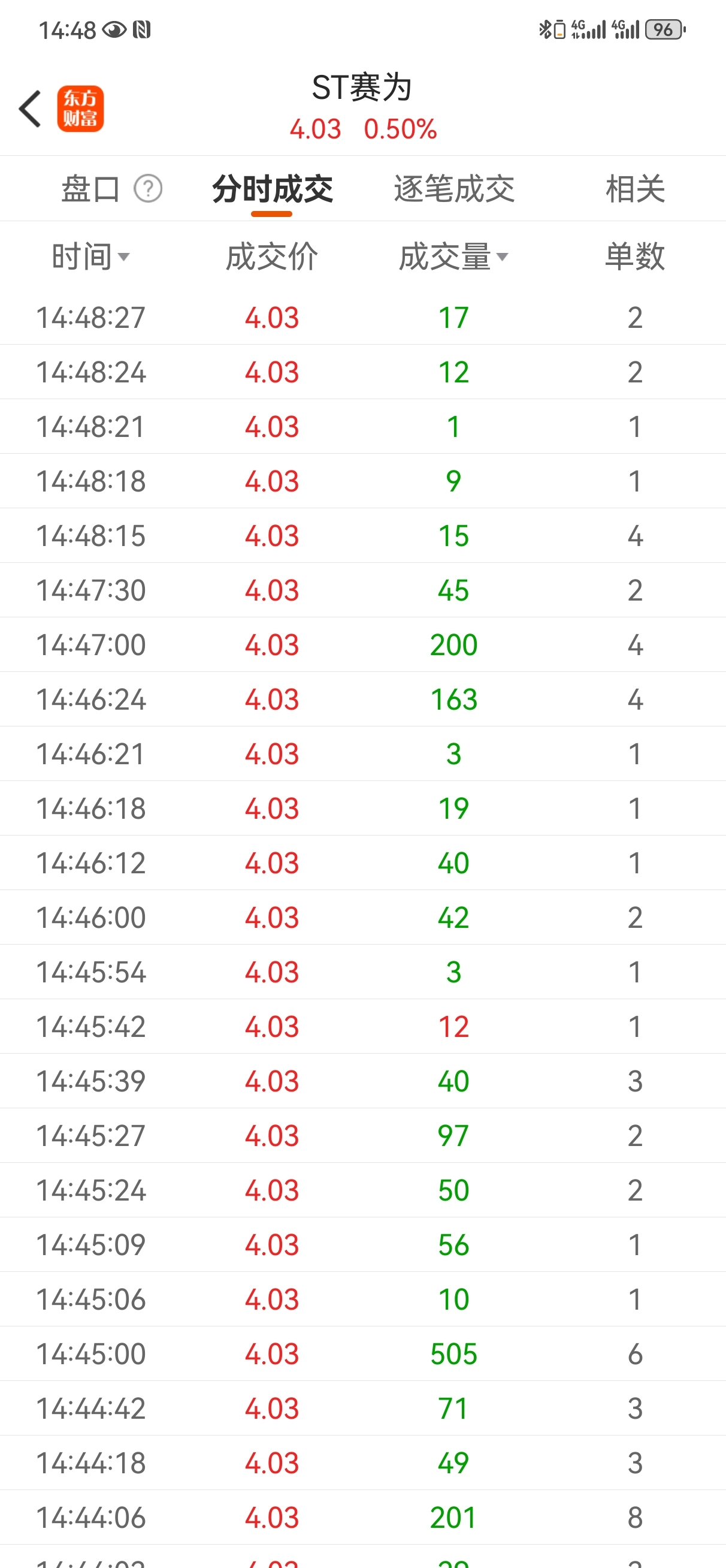 14:39到14:48这9分钟时间,分时交易只有一笔12手红单。这样的股想不退市
