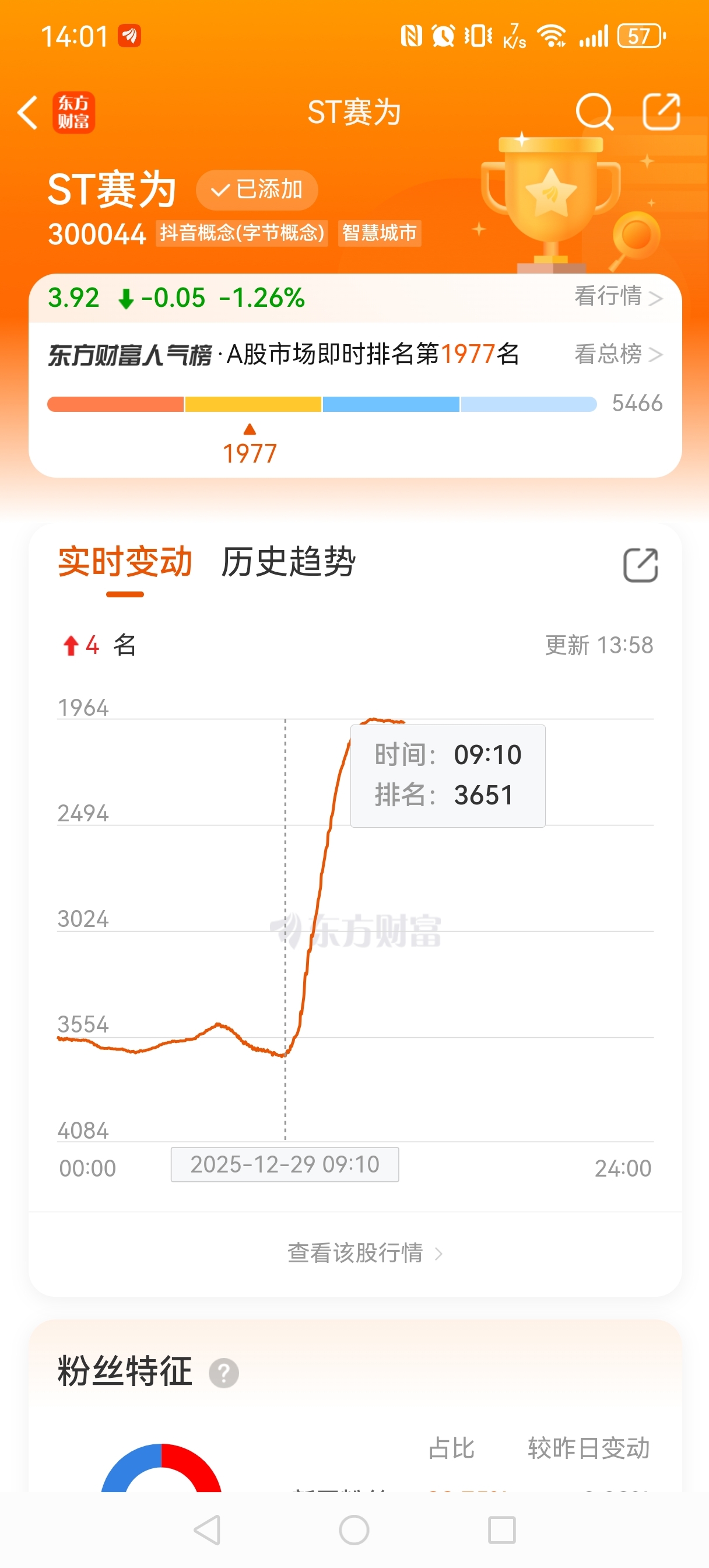 $ST赛为(SZ300044)$ 今天人气榜上升了1600多名,没有游资大佬过来拉一下吗。上升这么多人气不拉一波对不起这个上升的排名啊