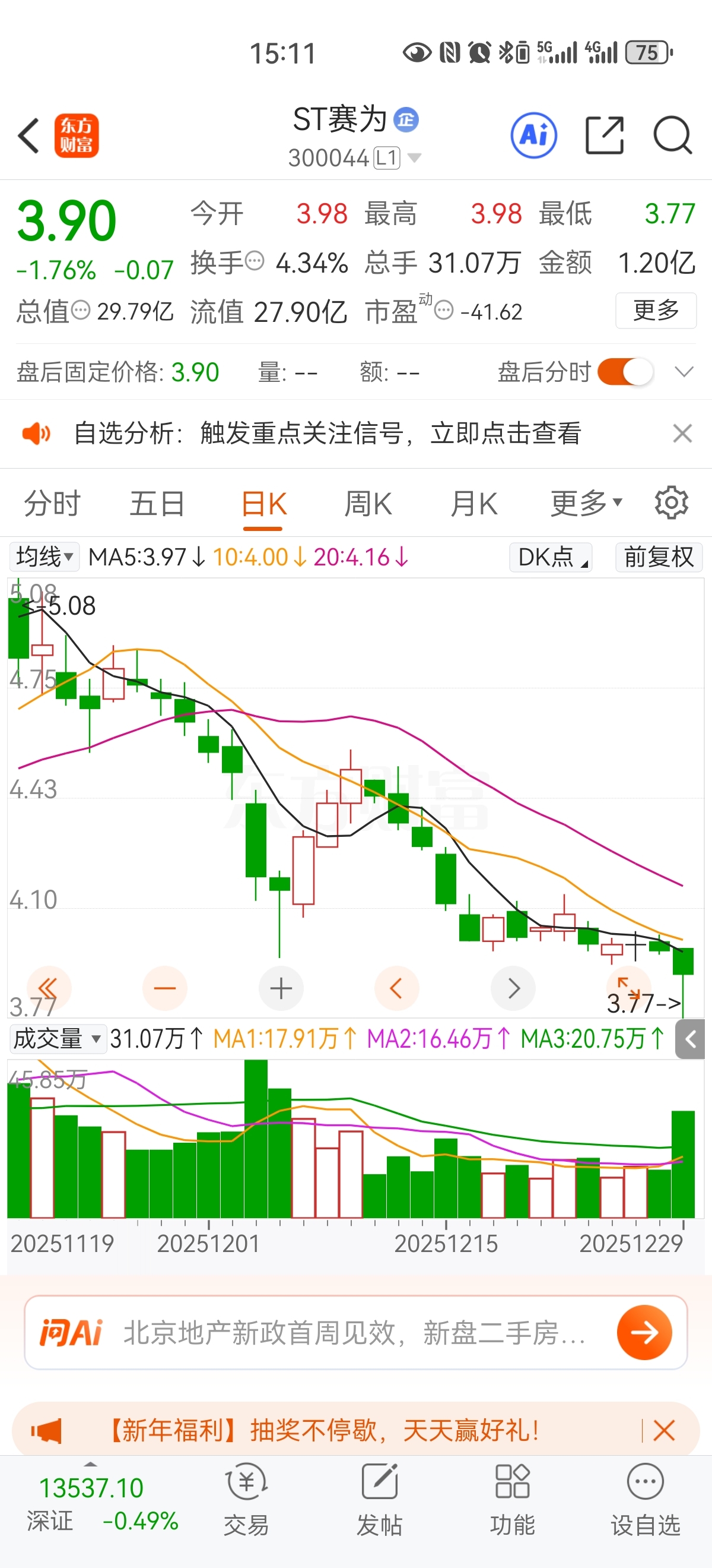 $ST赛为(SZ300044)$ 日线连跌30天无反弹,周线7连跌,狂跌了40%没反弹1分。不亏是A股跌王之王。