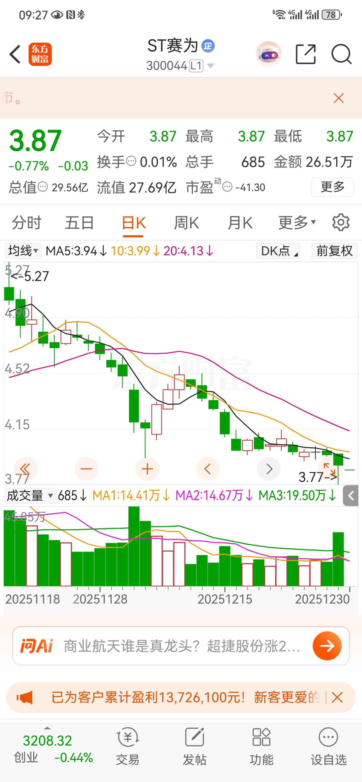 $ST赛为(SZ300044)$ 退市股都没有这种日线,何况一个还没公告退市的股。真的牛啊,多苟们还活着吗?