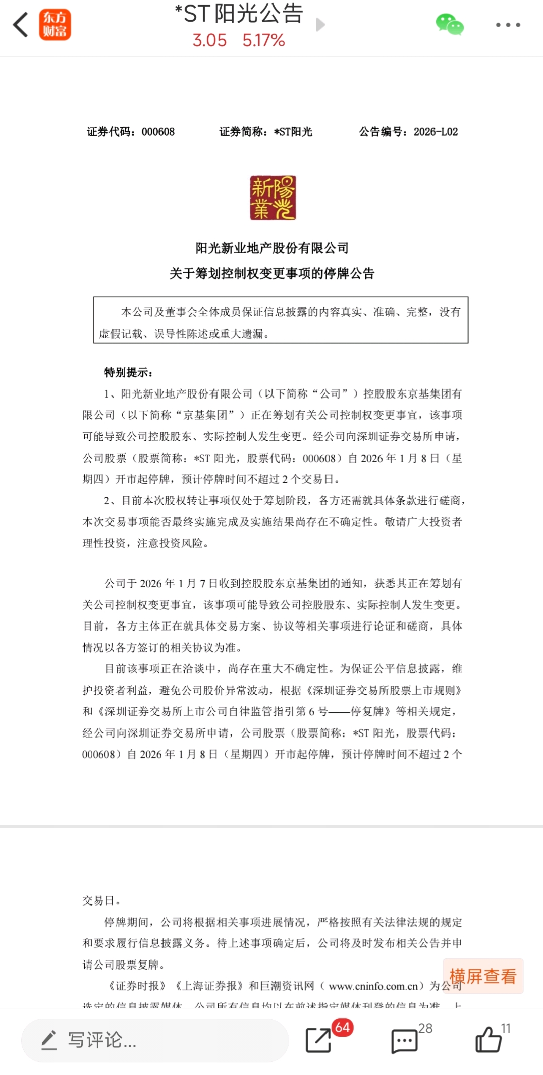 st阳光,周一复牌,要挂的待会可以抢了,早点挂,第一个板进,后面能多吃很多板,就算十几板后开板也会有很多大V来做接力,毕竟很大概率是deepseek借壳重组+邀约收购,参考主板的胜通能源,嘉美包装,锋龙股份,刘丹和DeepSeek创始人是同乡亲戚,周一一起见证20亿市值的st阳光百万封单$*ST铖昌(SZ001270)$ $*ST东易(SZ002713)$ $嘉美包装(SZ002969)$