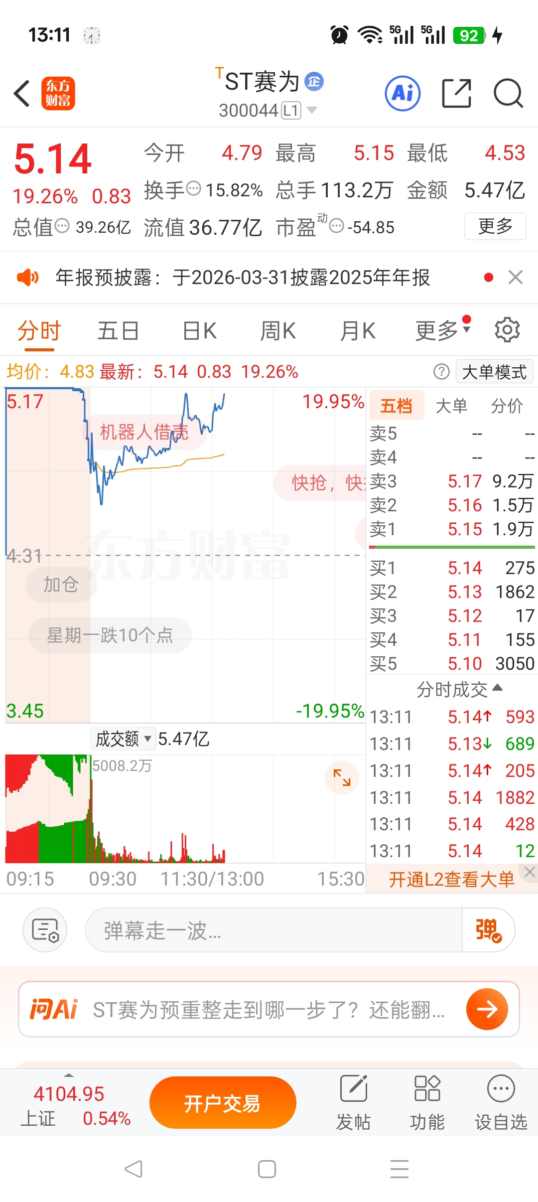 $ST赛为(SZ300044)$ 今天一直在盯盘,主力在涨停位置压板,拉涨停前换手17%,拉完涨停19%,赛为准备突破上年4月以来的新高。到星期一,豪绅的钱原数奉还,