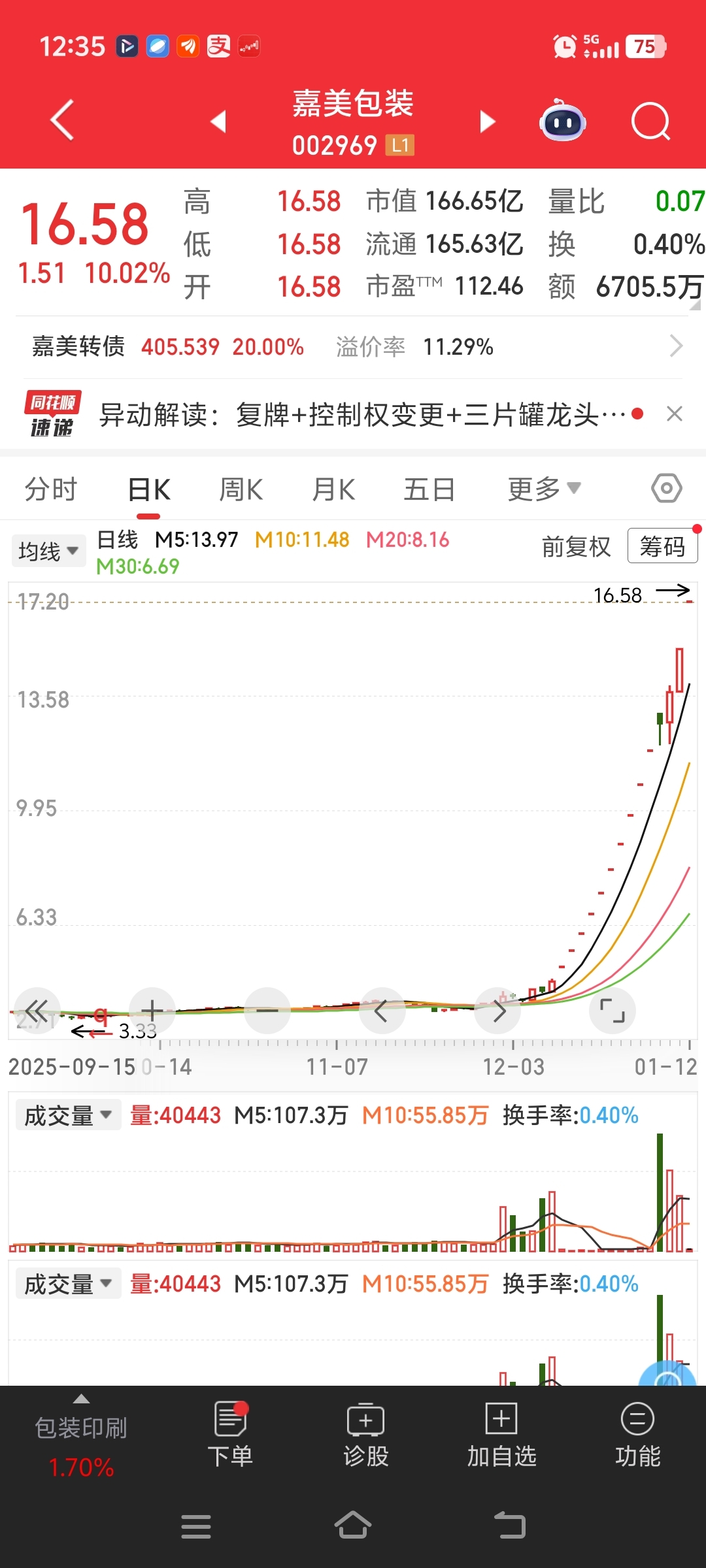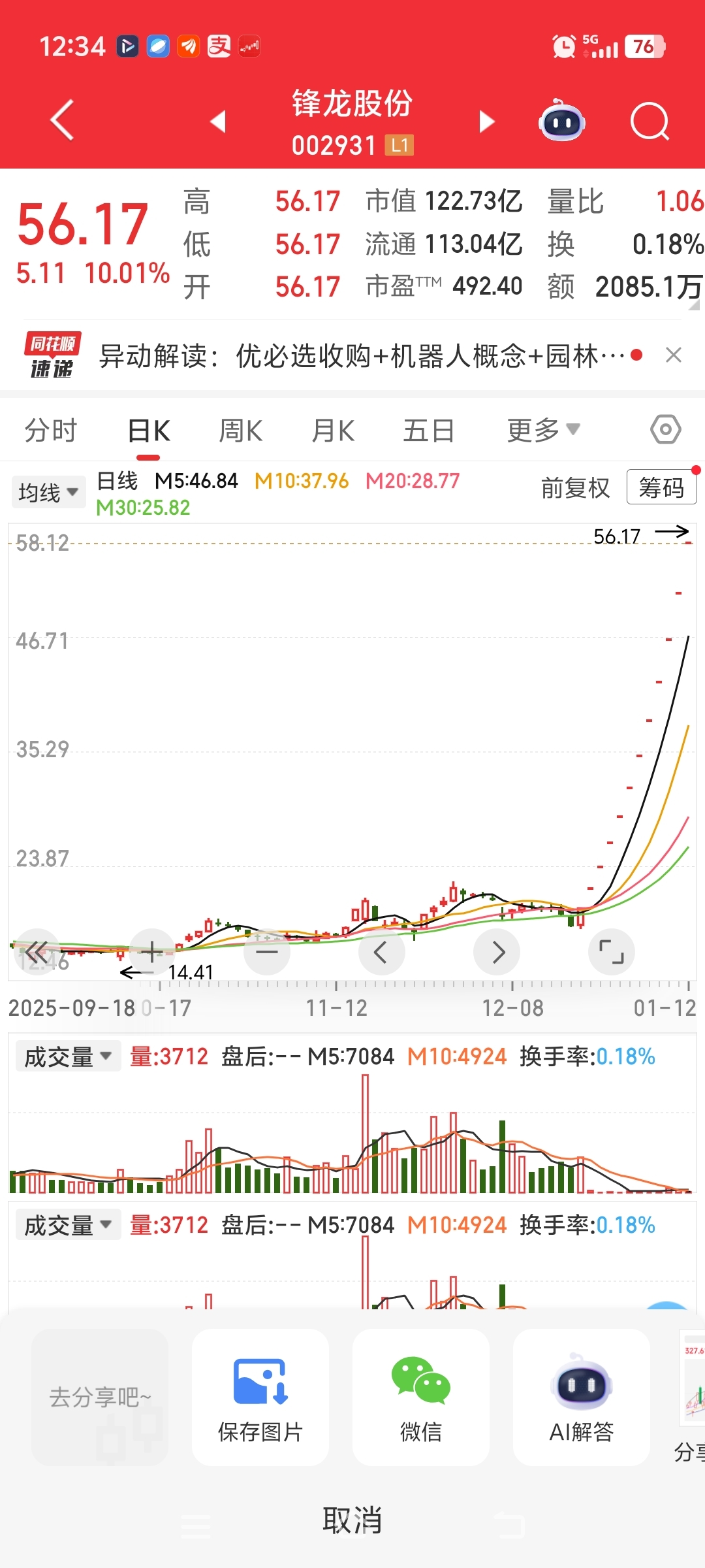 由于热门机器人公司收购,上纬新材股价从7元多到了今天的164元,上涨了22倍!锋龙股份连续11个一字板,股价从 17元到了今天的56元,而且后面还有很多一字板!嘉美包装从收购前的4元多到了今天的16.58元,而且行情还在持续当中!所以,如果众擎机器人借壳赛为,股价极有可能会到100元!所以,大家现在就卖出吗?