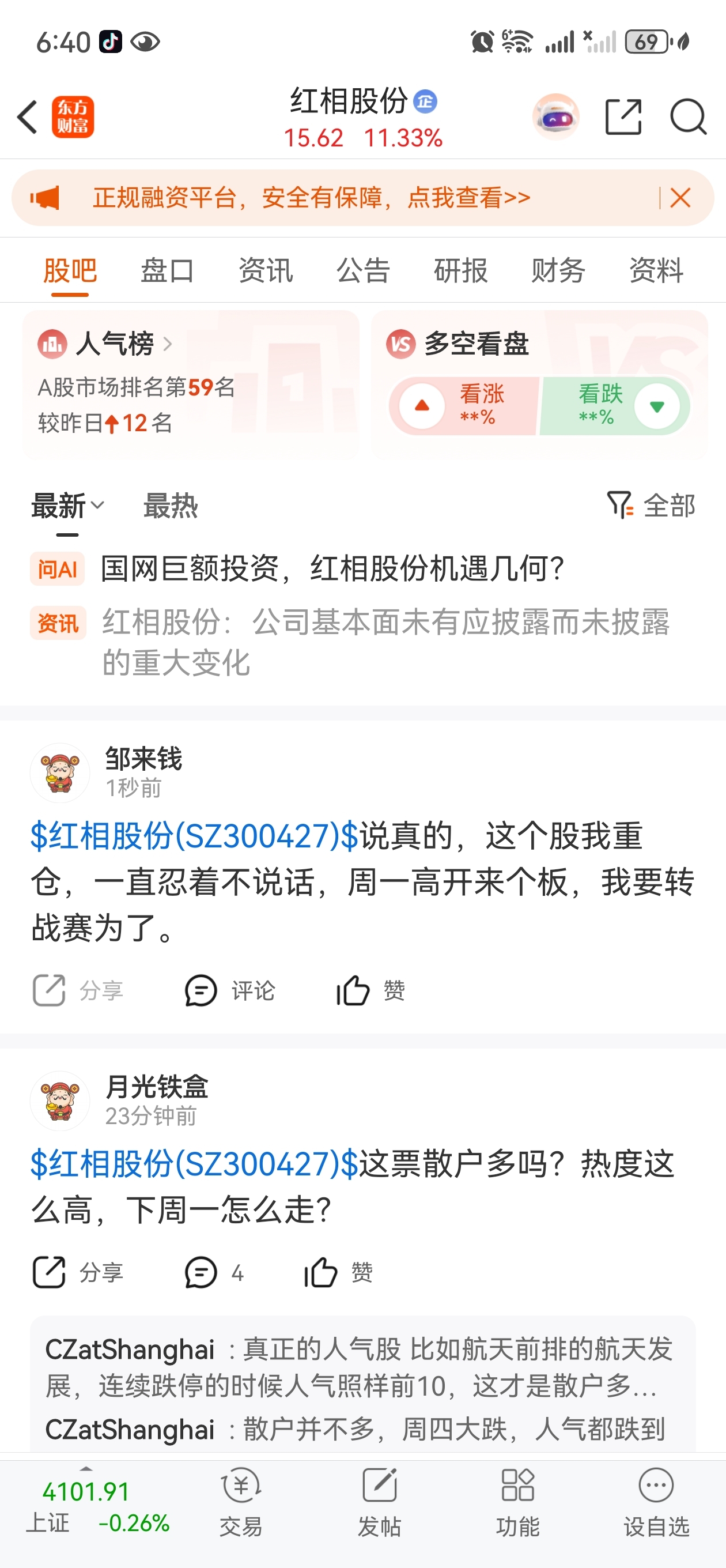 $ST赛为(SZ300044)$ 周一你跌下来,我就从红相过来抄你底,好心的主力给个机会。