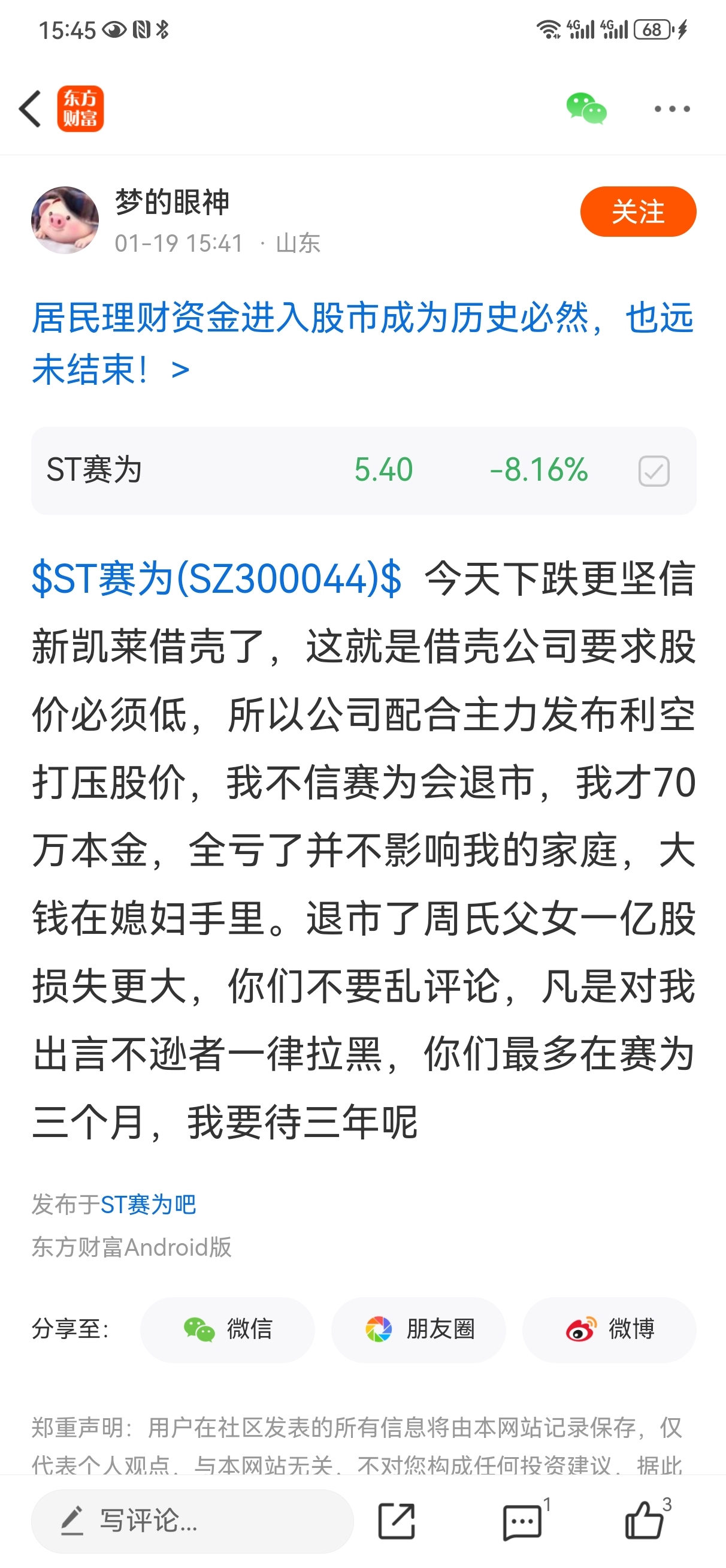 $ST赛为(SZ300044)$ 就这贴发的能自圆其说吗?能骗得到散户接盘吗?既然投资方要求必须打压股价,那拉到六块以上再打压下来干啥?你解释解释?唯一的解释就是拉高造成假象配合你们这帮多苟唱多骗人接盘。实际上根本不会有什么投资人报名,也一定会退市。这样所有的走势就都说的通了。你自己积点德吧。@梦的眼神