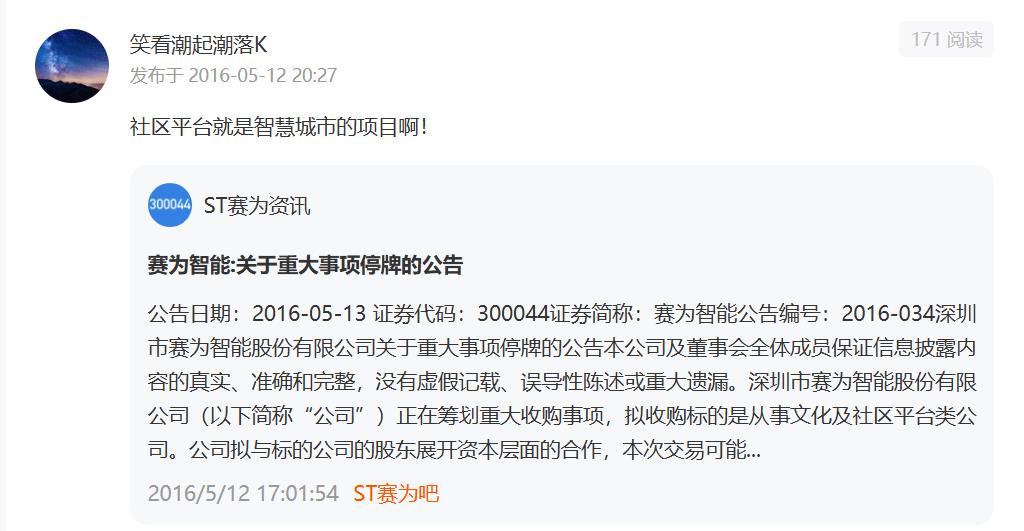 作为一个进出赛为十几年的股民,最近一直在加仓,从3元多起到5元多,再调还会加仓。去年11月开始再没卖出过赛为,就是要看到赛为重整结果,不论如何,认赌服输。