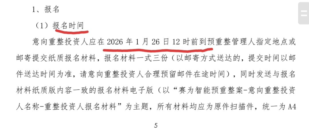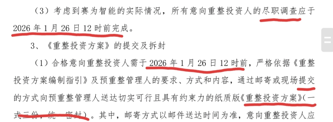 $ST赛为(SZ300044)$ 报名截止时间、尽职调查截止时间、《重整投资方案》提交截止时间、缴纳报名保证金截止时间和资格审查资料补正截止时间统一定在2026年1月26日12时前,再配合前今两天市场预期内仲裁纠纷和年报业绩预告利空提前落地,足以说明目前赛为重整已进入高效、高能、高指向性阶段,个人对赛为重整预后保持乐观看法