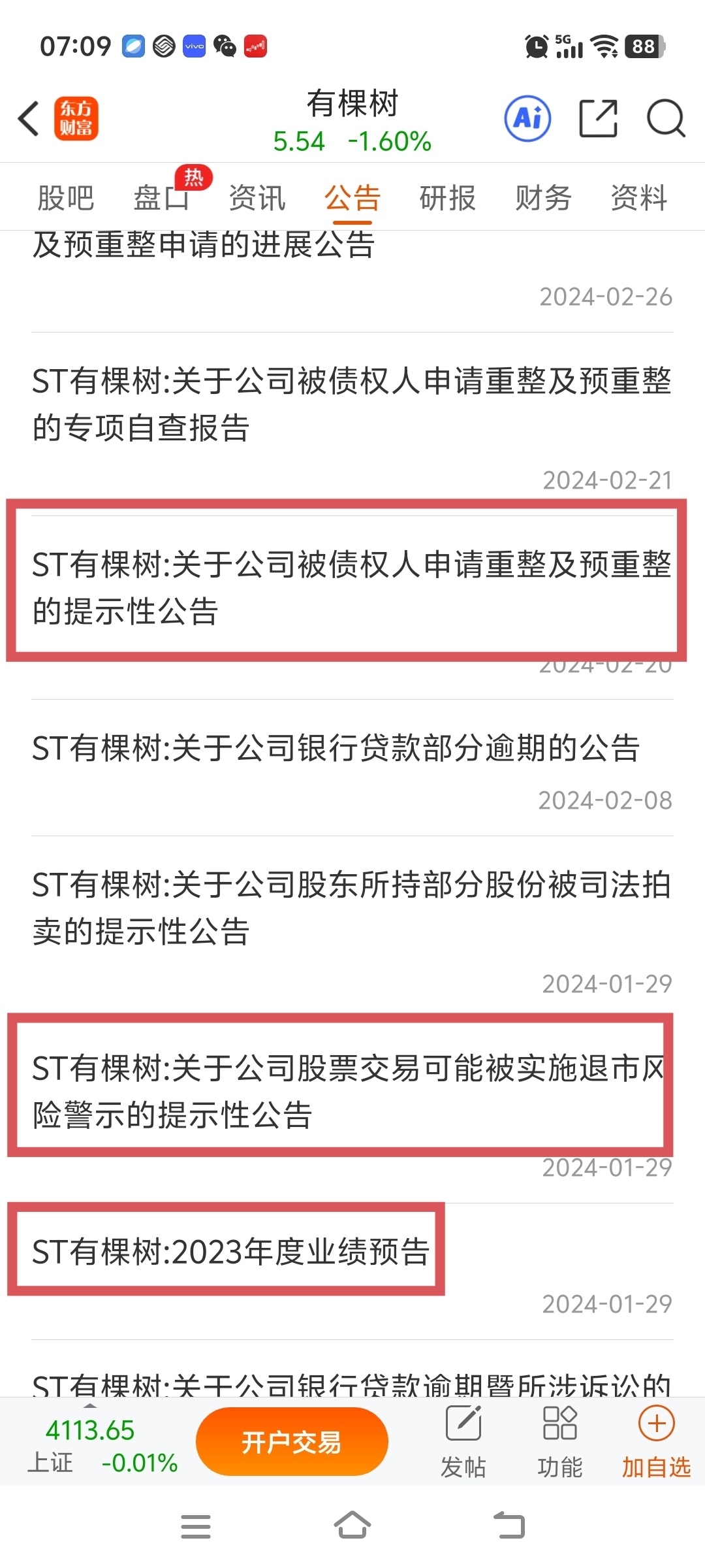 ST有棵树也是2024年1月29日发布业绩预亏公告,同时预计加星,当天股价 1.63元,20天后重整,当年股价最高6.5元!