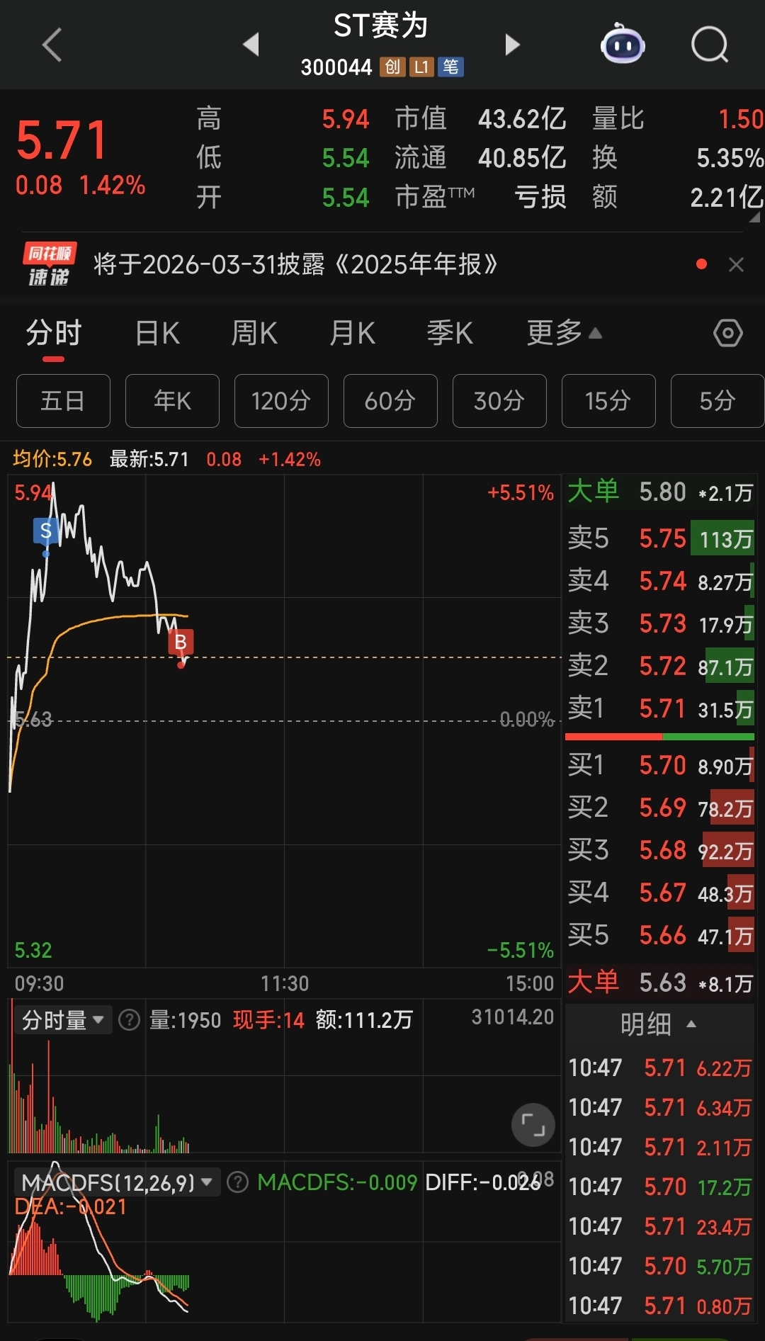 $ST赛为(SZ300044)$ 我就知道要冲高回落