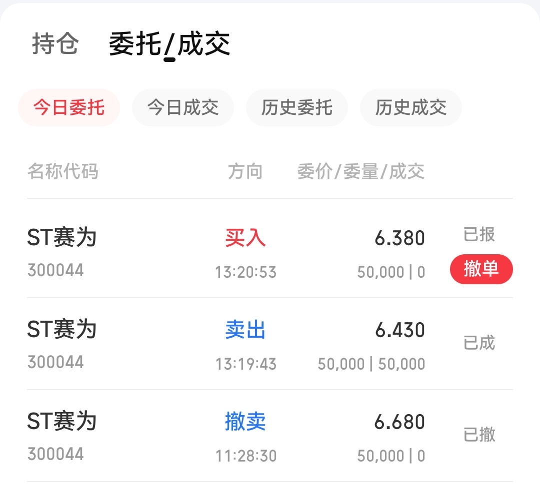 $ST赛为(SZ300044)$ 今天真的是要被自己的操作蠢哭了,上午快下班的时候看压单很大,估计下午要拉升,就挂了个6.68的单,希望能成交,结果下午领导要开会,一点多点就被喊醒了,想着一会没办法操作,就赶紧撤单挂现价出了五百手,下午开完会就收盘了,如果下午不撤单就完美了,上班害人,做飞了五百手!