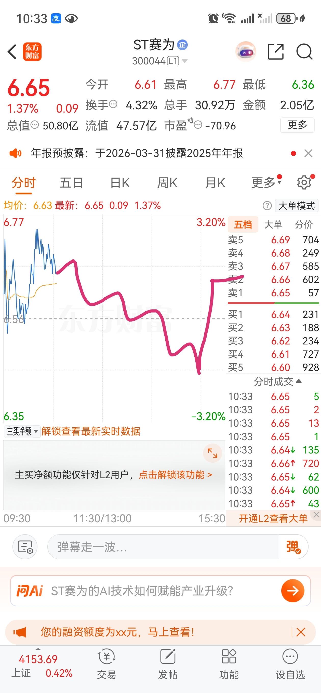 $ST赛为(SZ300044)$ 今天的走势,尾盘拉起来,继续出货。