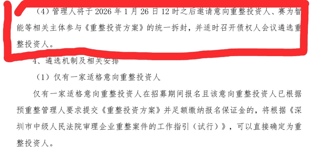 “考虑到赛为智能的实际情况,所有意向重整投资人的尽职调查应于2026年1月26日