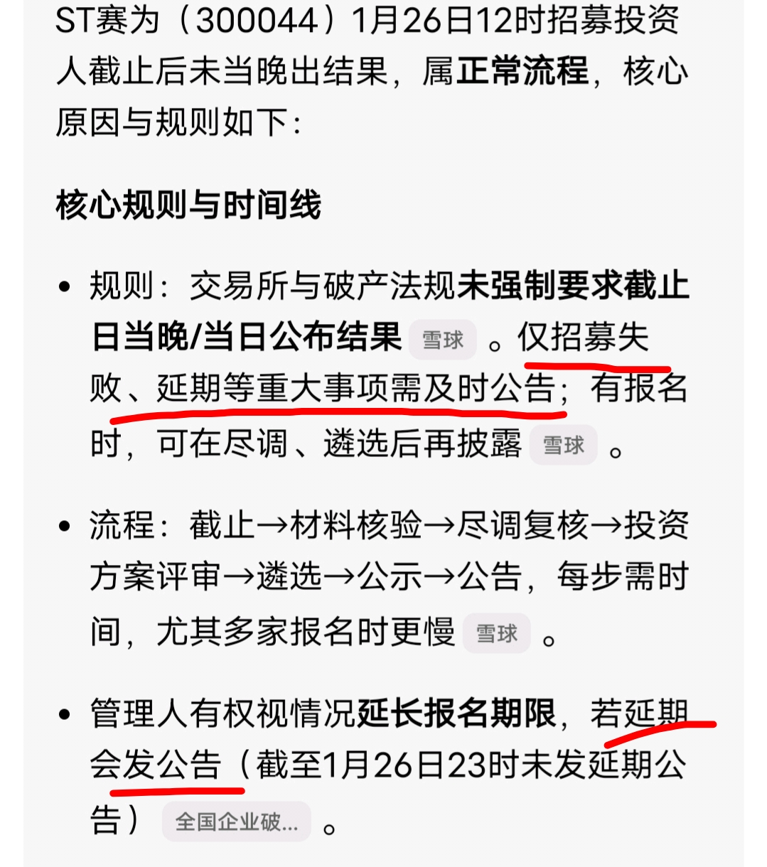 $ST赛为(SZ300044)$ 己招到投资人,若延期正常要及时公告
