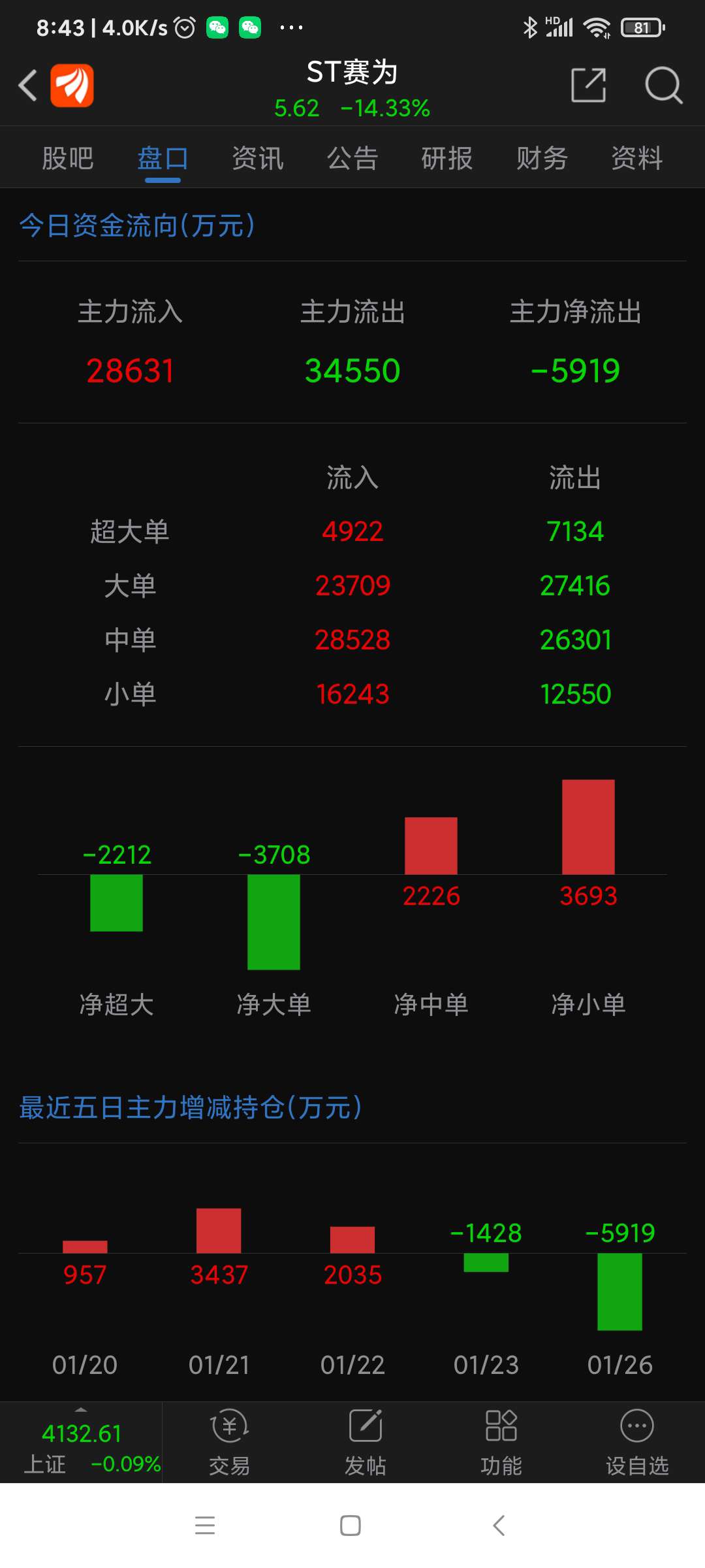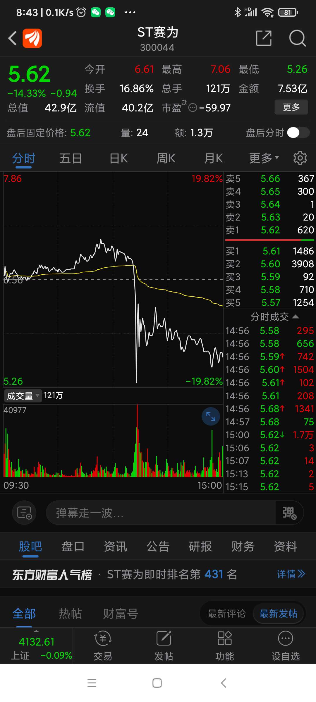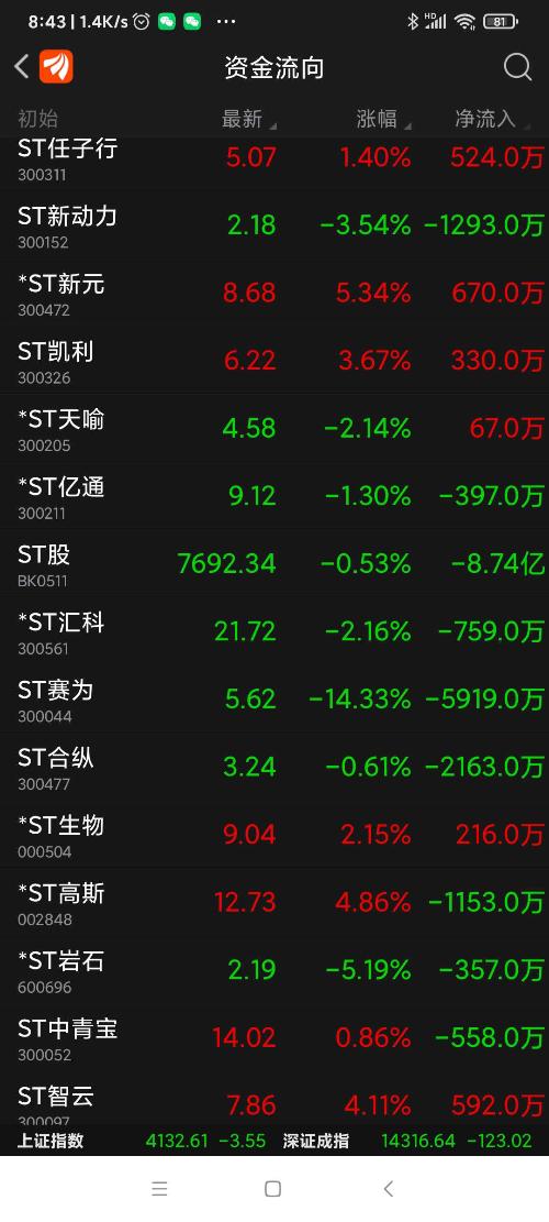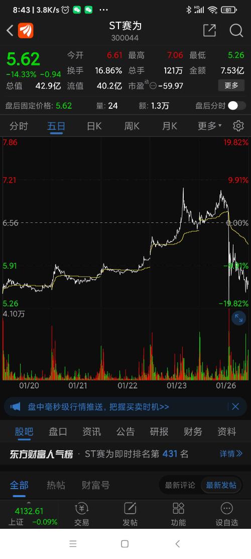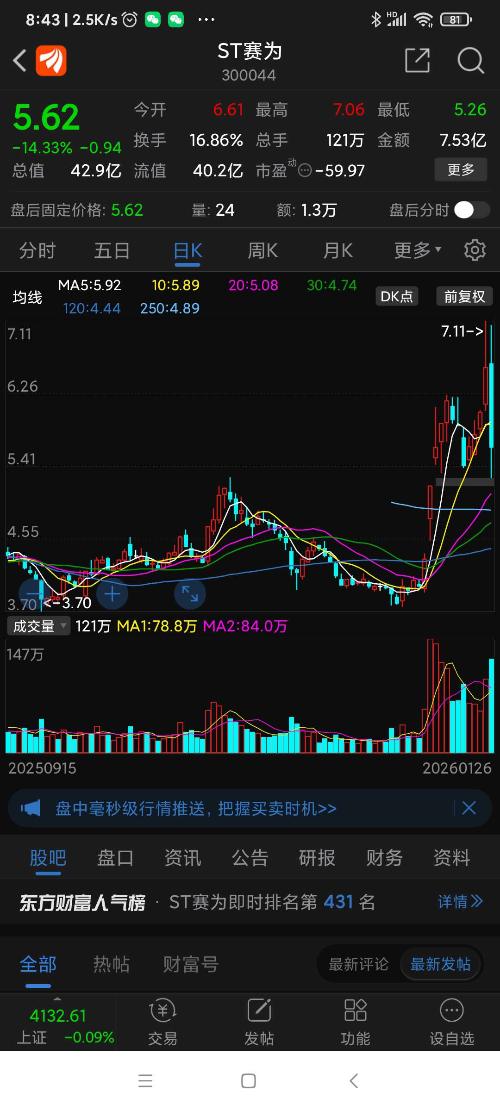ST赛为公告,年报公布后因净资产为负值,将被加*号,变为*ST赛为,昨日跌幅列沪深股市第二名。