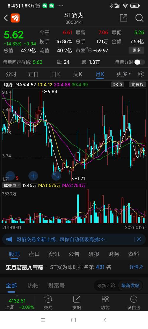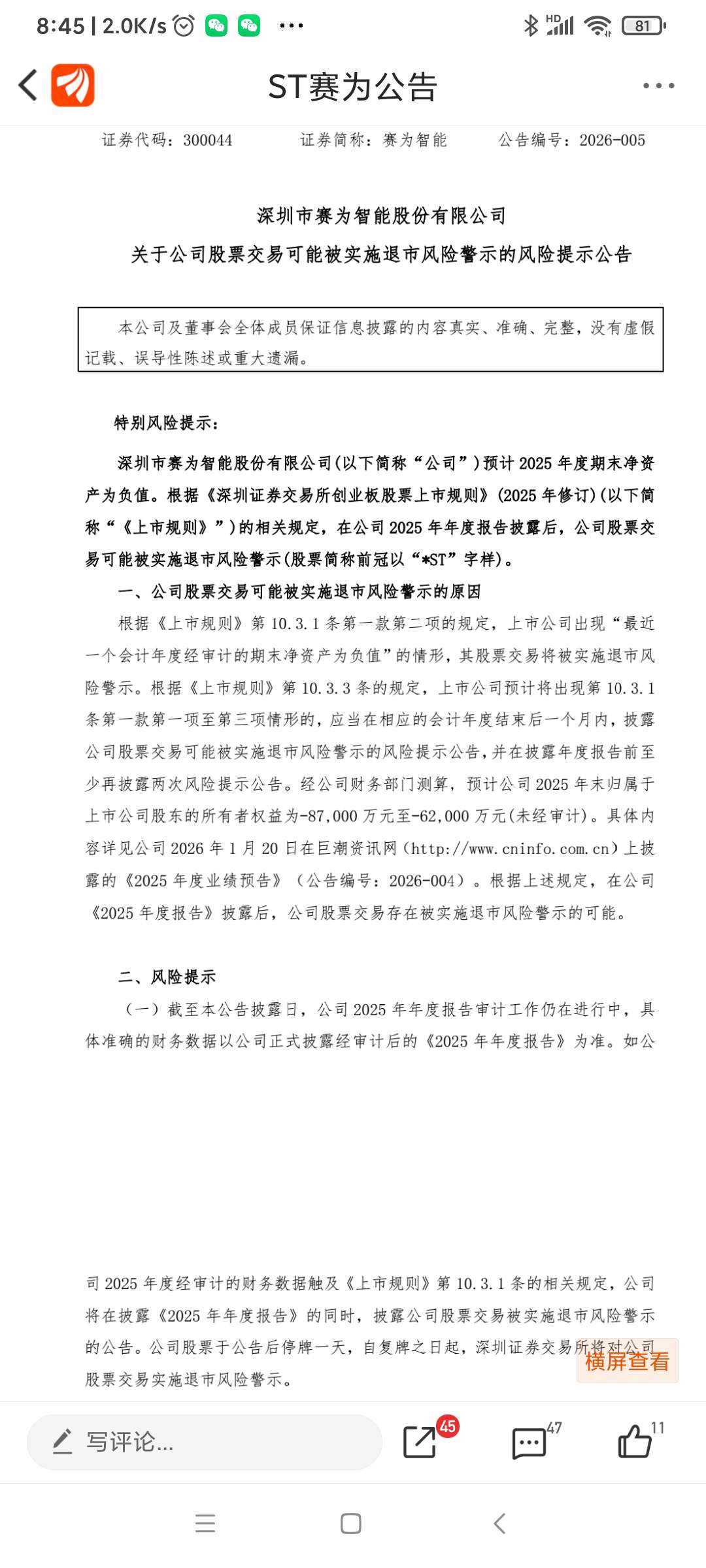 ST赛为公告,年报公布后因净资产为负值,将被加*号,变为*ST赛为,昨日跌幅列沪
