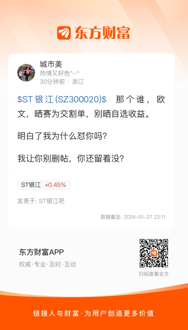 温馨提示: 1.根据《证券法》规定,禁止编造、传播虚假信息或者误导性信息,扰乱证券市场;2.用户在本社区发表的所有资料、言论等仅代表个人观点,与本网站立场无关,不对您构成任何投资建议。用户应基于自己的独立判断,自行决定证券投资并承担相应风险。《东方财富社区管理规定》