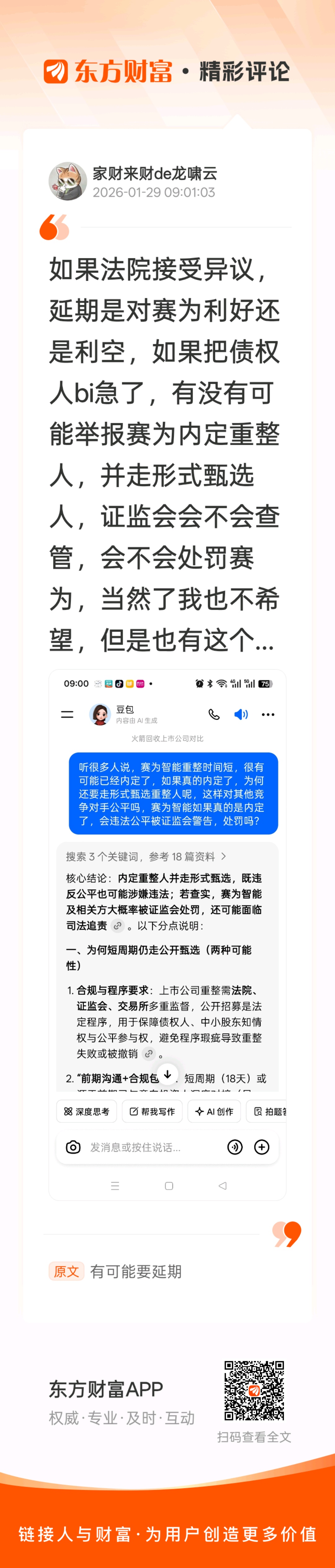 //@家财来财de龙啸云 :如果法院接受异议,延期是对赛为利好还是利空,如果把债权人bi急了,有没有可能举报赛为内定重整人,并走形式甄选人,证监会会不会查管,会不会处罚赛为,当然了我也不希望,但是也有这个可能的哈,