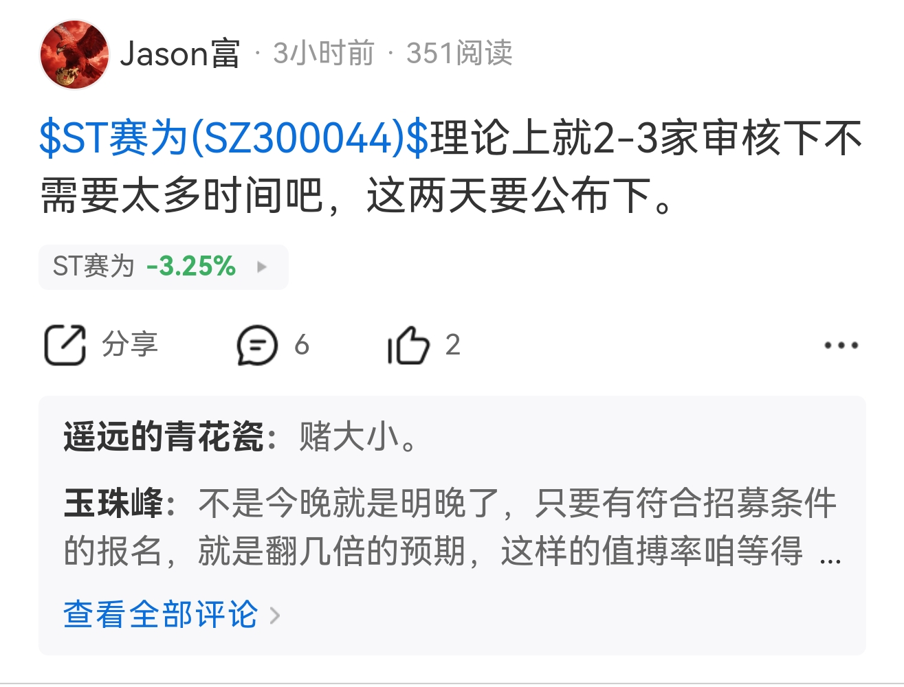 $ST赛为(SZ300044)$ 神算子,没白浪费我时间研究出来的结果。