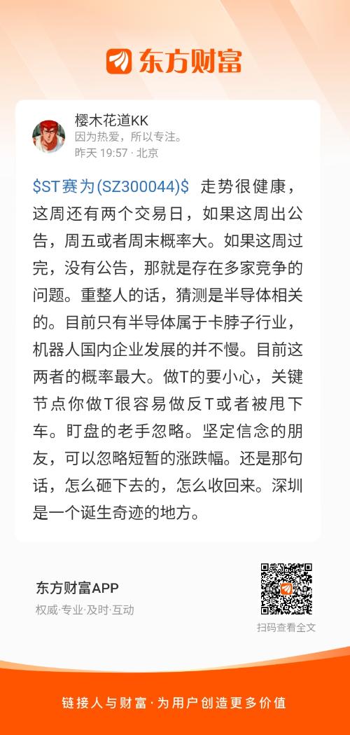 $ST赛为(SZ300044)$ 走势很健康,这周还有两个交易日,如果这周出公告,周五或者周末概率大。如果这周过完,没有公告,那就是存在多家竞争的问题。重整人的话,猜测是半导体相关的。目前只有半导体属于卡脖子行业,机器人国内企业发展的并不慢。目前这两者的概率最大。做T的要小心,关键节点你做T很容易做反T或者被甩下车。盯盘的老手忽略。坚定信念的朋友,可以忽略短暂的涨跌幅。还是那句话,怎么砸下去的,怎么收回来。深圳是一个诞生奇迹的地方。