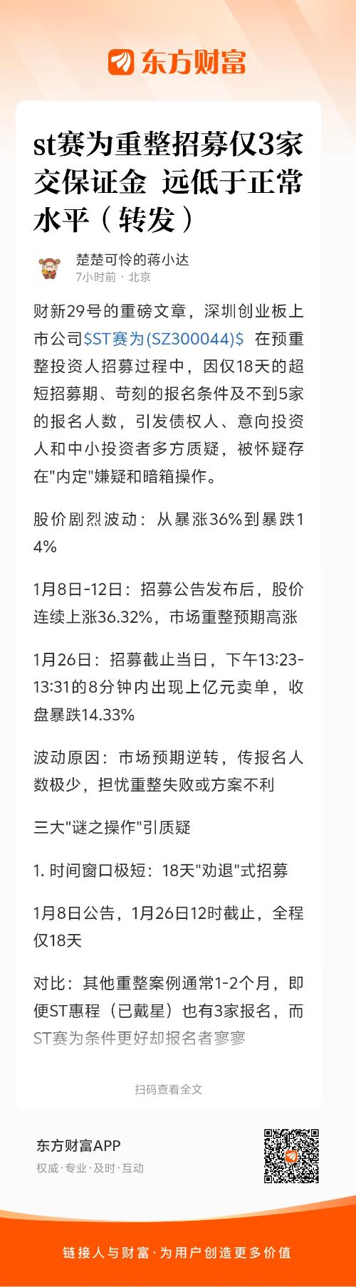 财新29号的重磅文章,深圳创业板上市公司$ST赛为(SZ300044)$ 在预重整投资人招募过程中,因仅18天的超短招募期、苛刻的报名条件及不到5家的报名人数,引发债权人、意向投资人和中小投资者多方质疑,被怀疑存在"内定"嫌疑和暗箱操作。
