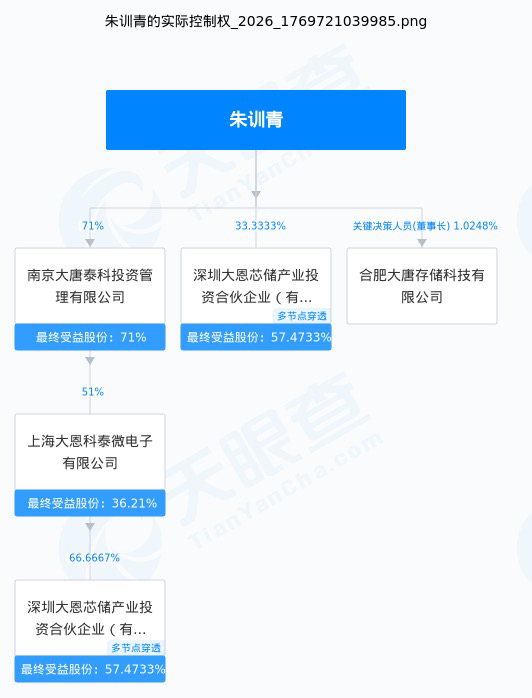 2026年1月12日成立,可以说这个公司就是为了重整赛为而新设立的公司,大恩芯储听名字就知道是芯片公司了,实控人是朱训青。