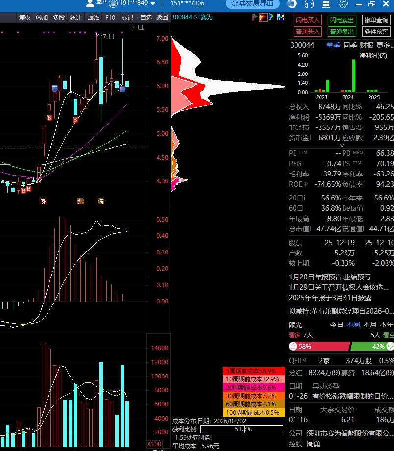 $ST赛为(SZ300044)$ 收盘了,大跌4.32,其实股价倒没跌多点,还在6元上下,今天和上周五从K线看就是揉搓线,这是精典的洗盘手法,看来主力就控制在6元上下,慢慢的把场内小散平均成本基本握制在6到7元之间,看下面的筹码峰,3-5元的筹码正在逐步减少,而6元多在逐步增加。到签协议前不会大涨也不会大跌,明天又会回到6元以上振荡了,继续熬吧,依然坚定看多赛为的明天!