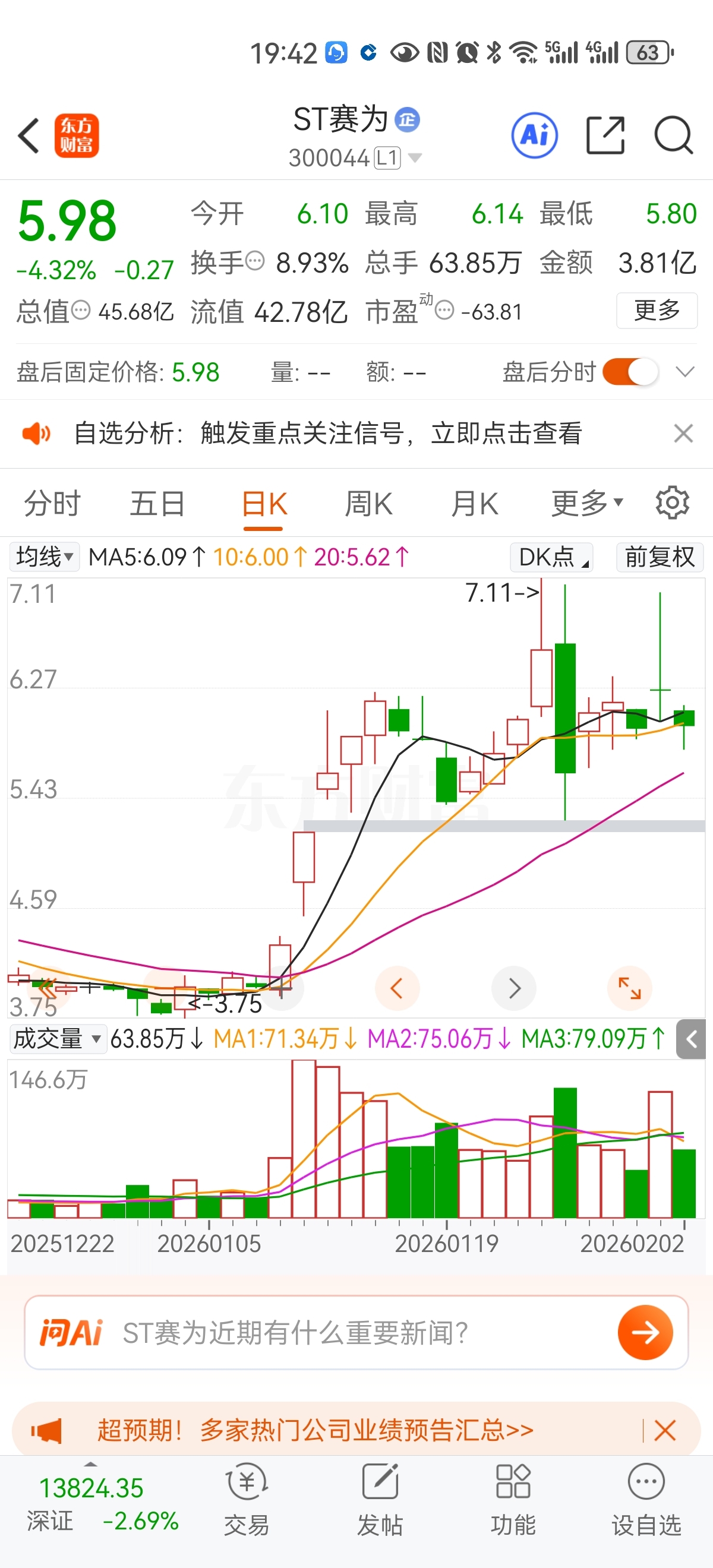$ST赛为(SZ300044)$ 这几个大阴线避雷针,哪根都比多苟的命还长