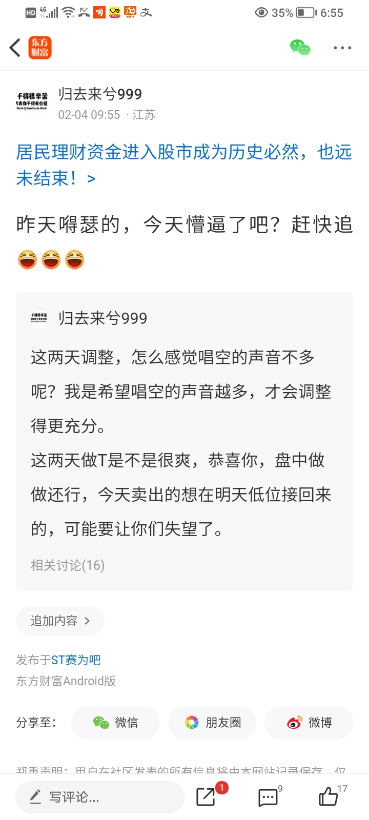 温馨提示: 1.根据《证券法》规定,禁止编造、传播虚假信息或者误导性信息,扰乱证券市场;2.用户在本社区发表的所有资料、言论等仅代表个人观点,与本网站立场无关,不对您构成任何投资建议。用户应基于自己的独立判断,自行决定证券投资并承担相应风险。《东方财富社区管理规定》