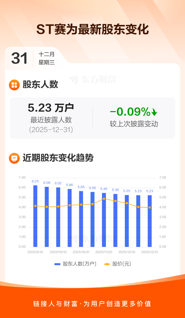 ST赛为:截至12月31日最新股东户数5.23万户,较上期减少0.09%