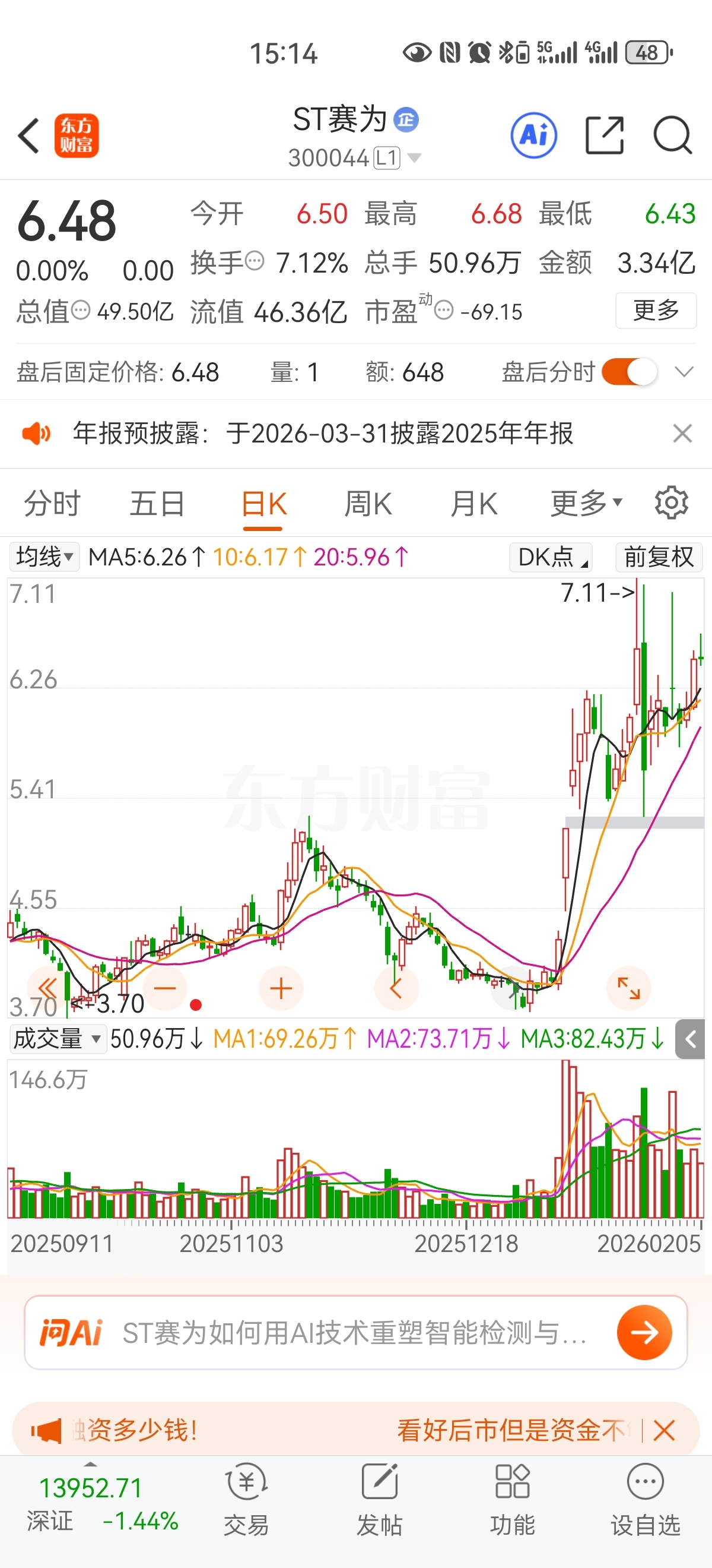 $ST赛为(SZ300044)$ 看看这日线一年几百根上影线,几百次拉高出货跳水套人。别的重整股确实能翻几倍,但赛便重整成功也涨不了60%。买了赛便你只能天天看着外面几千股上涨,而你只能天天白玩。