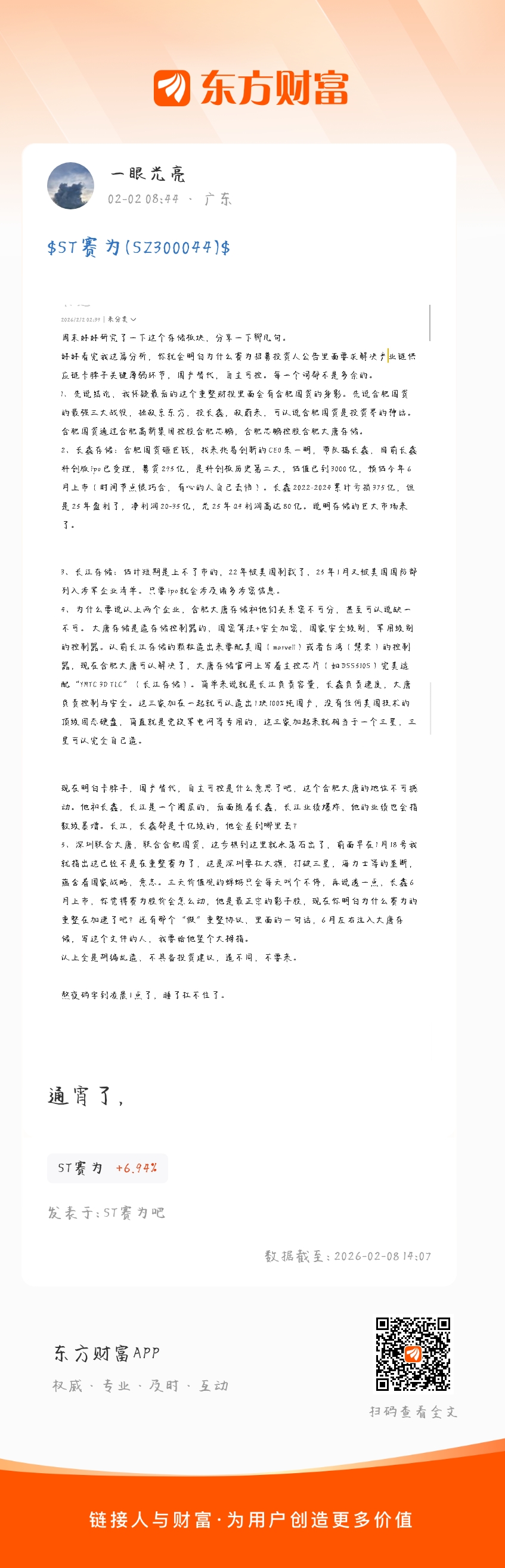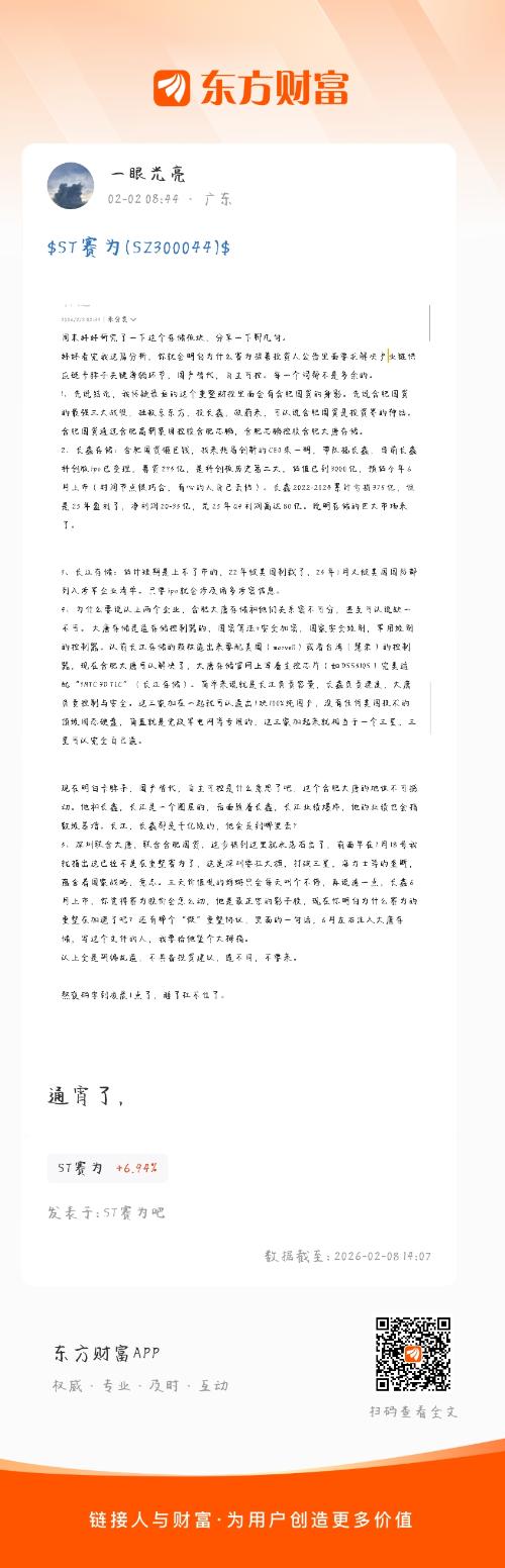接着上一篇再来聊聊1、存储芯片市场外部打的火热,三星,sk海力士,美光三巨头垄断了全球HBM高端市场,近日,HP各大电脑厂商,说考虑中国存储芯片公司的供货,长鑫的产品,定价是这3家巨头的1/3,极具竞争力,可以想象的是,赛为后面的前景,只要AI还在快速发展,HBM就是极度稀缺的弹药。2、深圳栖梧智芯科技,工商方面这家公司的信息完全查不到,法人陈欣桐更是全网搜不到。但有一点可以确定,栖梧智芯这个词肯定不会随便使用,我猜测这家新成立spv是后面用来装半导体资产的。还记得我面一直提的,深重投在38层(下面有个存储芯片公司,升维旭),赛为在25层,然而,截止到现在,所有的公告都表明,除了招平深圳国资持有的8%股权,并没有深圳国资加入赛为的痕迹,这是不符合逻辑,推理的。所以我猜测深圳栖梧智芯这个公司背后的股东可能是深圳国资的,只是现在不能透露出来。赛为的下一步就是合肥大唐存储+深重投控股的升维旭,直接将存储芯片公司进行整合。彻底解决卡脖子问题。3、当然这只是我的推断,随着公告越来越多,一切都会慢慢明朗。以上不具备投资建议,只是分享逻辑。 巨婴勿扰