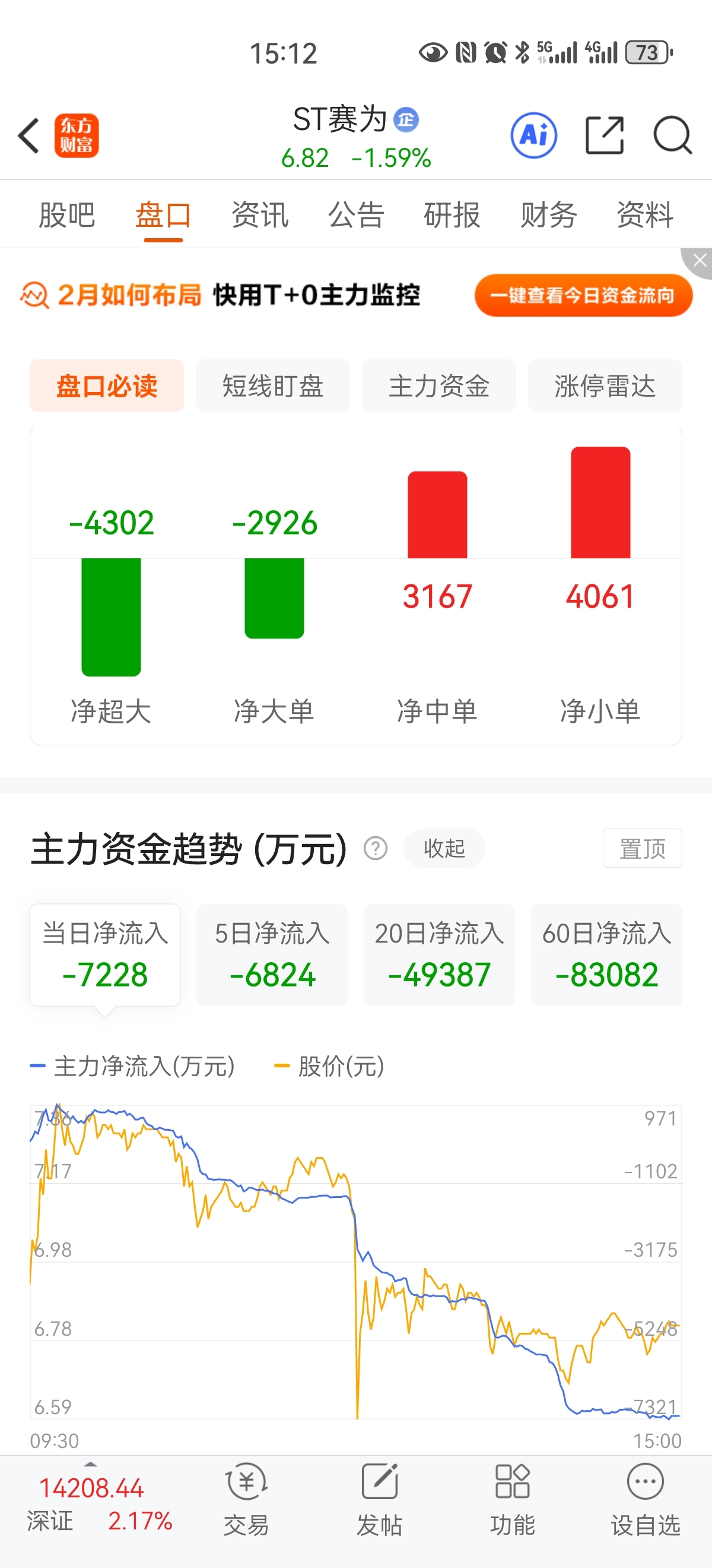 $ST赛为(SZ300044)$ 赛便的散户像极了一些鞋教的狂热信徒。就算今天赛便就退市它们也不会清醒的。自己数数多少根避雷针,自己看看资金跑路了多少。还在幻想的只能自取灭亡。春节前还有四个交易日,至少60个点的跌幅。