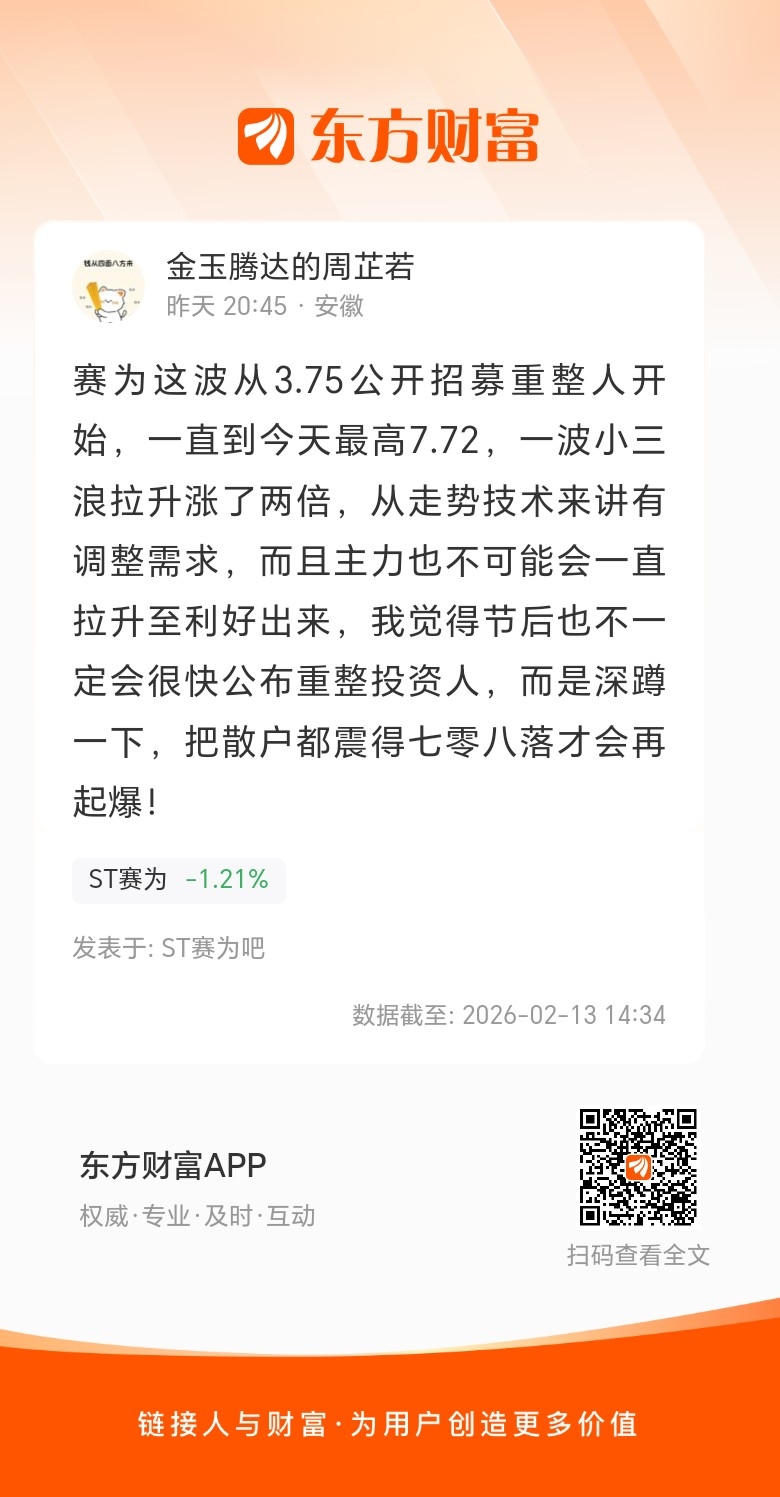@看来我的感觉还是对的,赛为如期调整,节后也应该不会很快公布重整投资人,还得剧烈
