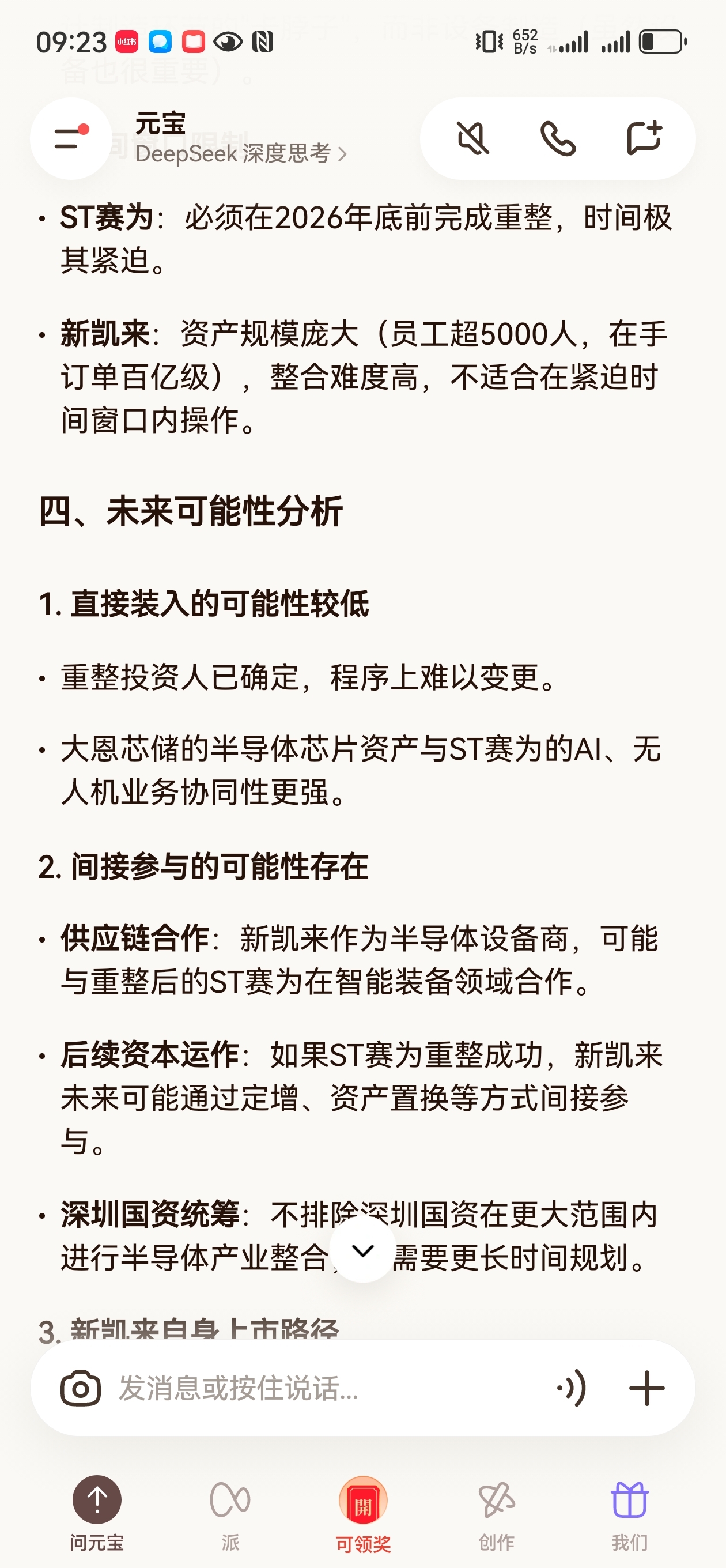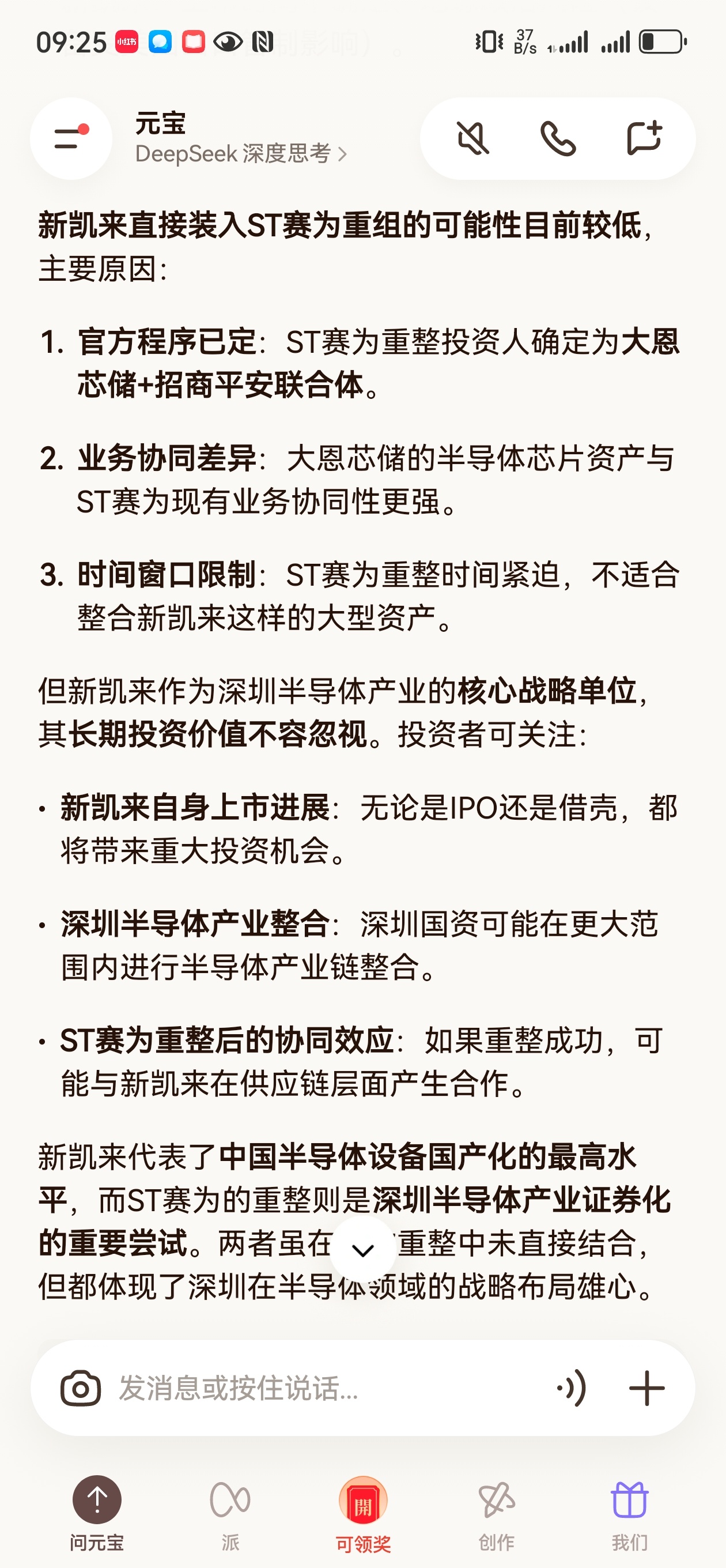 深圳新凯来半导体设备制造,应该会独立IPO,赛为未来半导体芯片设计制造,都是解决卡脖子国家队,所以导入大恩芯储意义更重大,深圳未来半导体两条龙头加持,产业集群想象空间很大,关键深圳司法走在前面,曾有32天完成赫美集团重组案例,ST赛为注定是半导体行业重组的一个里程碑