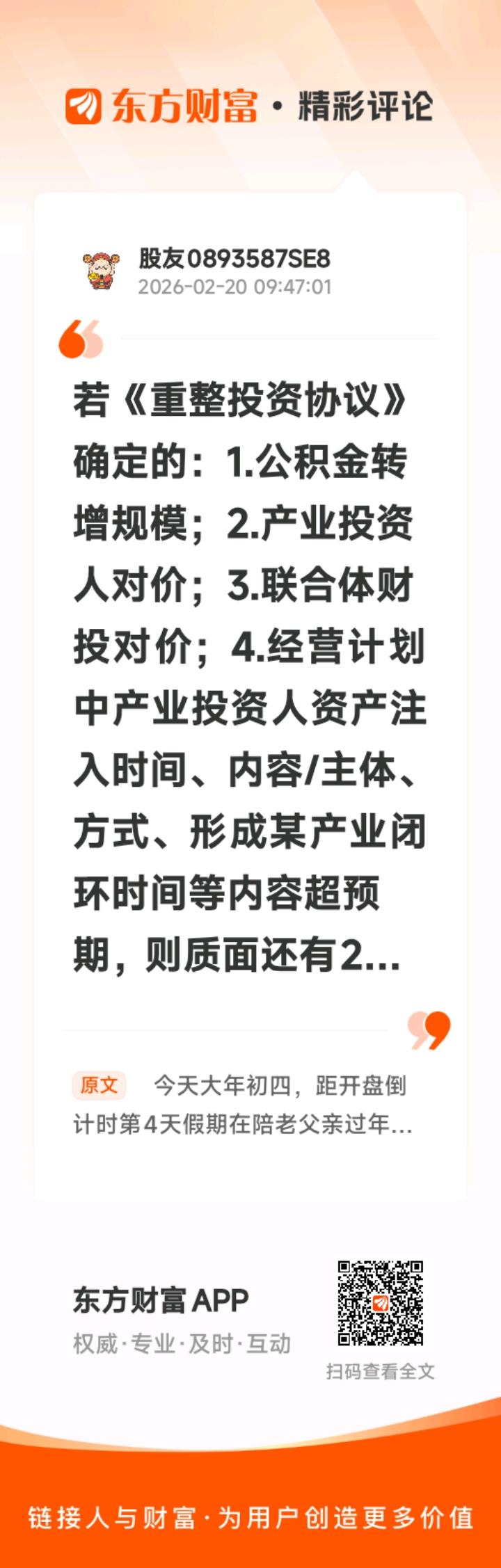 //@股友0893587SE8 :若《重整投资协议》确定的:1.公积金转增规模;2.产业投资人对价;3.联合体财投对价;4.经营计划中产业投资人资产注入时间、内容/主体、方式、形成某产业闭环时间等内容超预期,则质面还有2~5个一字涨停板。
