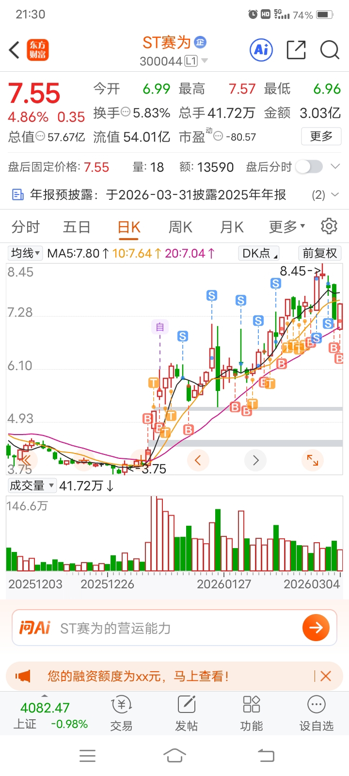 $ST赛为(SZ300044)$ 价格低就收2万股货。