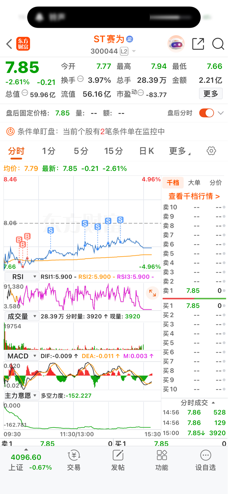 $ST赛为(SZ300044)$ 今天老赛这个T做的还行,少亏五六百,但是在墨龙挨了顿毒打