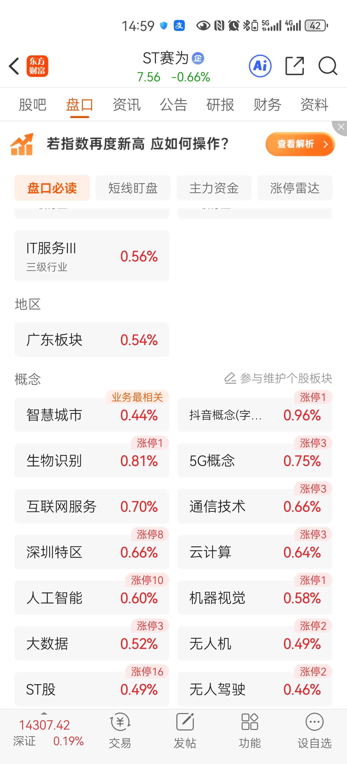 $ST赛为(SZ300044)$ 天天逆市下跌。今天要不是所有板块都大涨,赛便今天最少跌5%,大盘和板块把赛便救了,即使板块指数涨这么好,也不影响赛便连跌六天。六天跑输创业板指数10%。还是赛便牛逼。